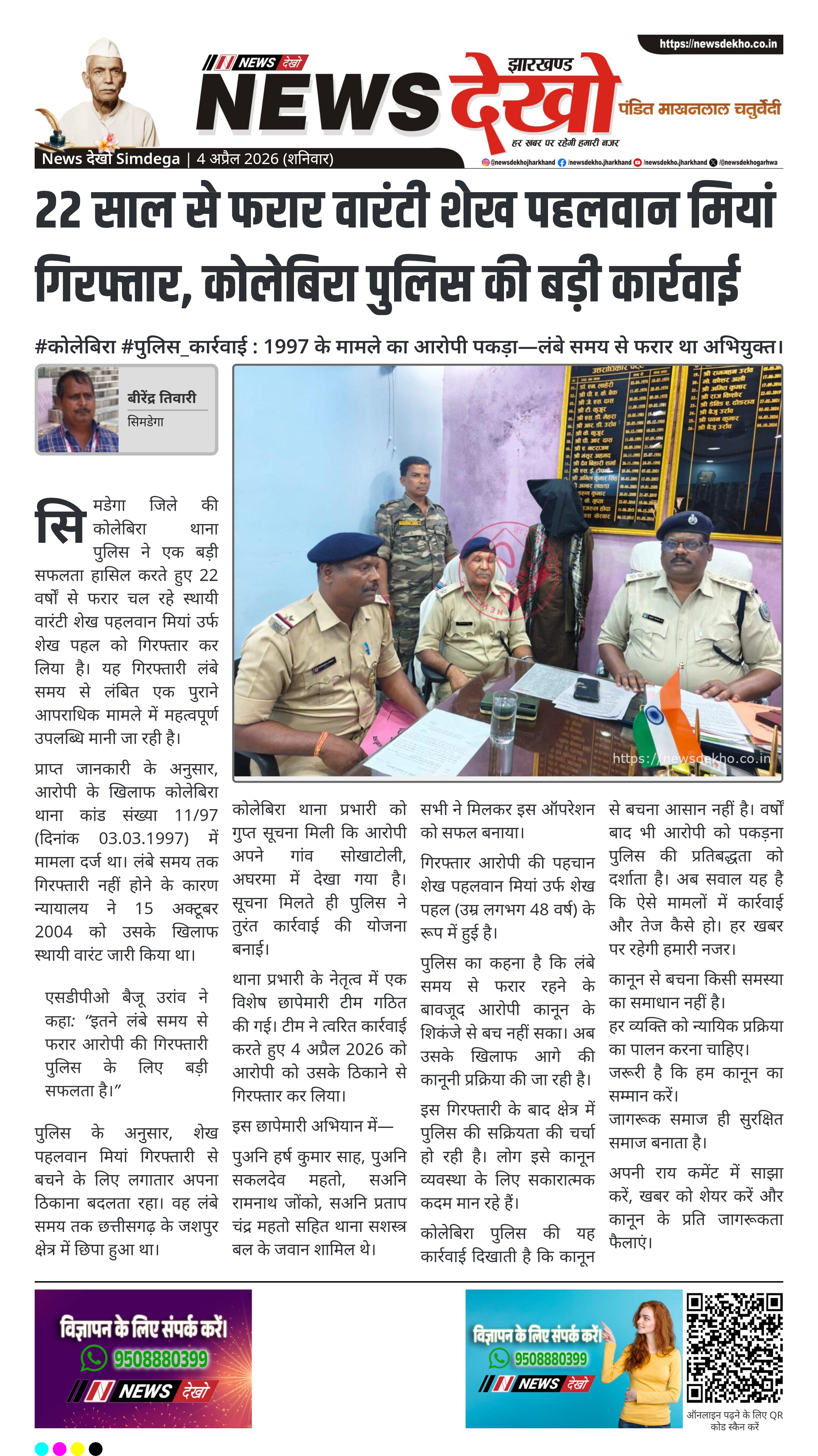 सिमडेगा जिले के कोलेबिरा थाना पुलिस ने 22 वर्षों से फरार स्थायी वारंटी शेख पहलवान मियां को गिरफ्तार किया है। आरोपी 1997 के एक मामले में वांछित था और उसके खिलाफ 2004 में वारंट जारी हुआ था। गुप्त सूचना के आधार पर 4 अप्रैल 2026 को उसे गिरफ्तार किया गया। इस कार्रवाई को पुलिस की बड़ी सफलता माना जा रहा है।