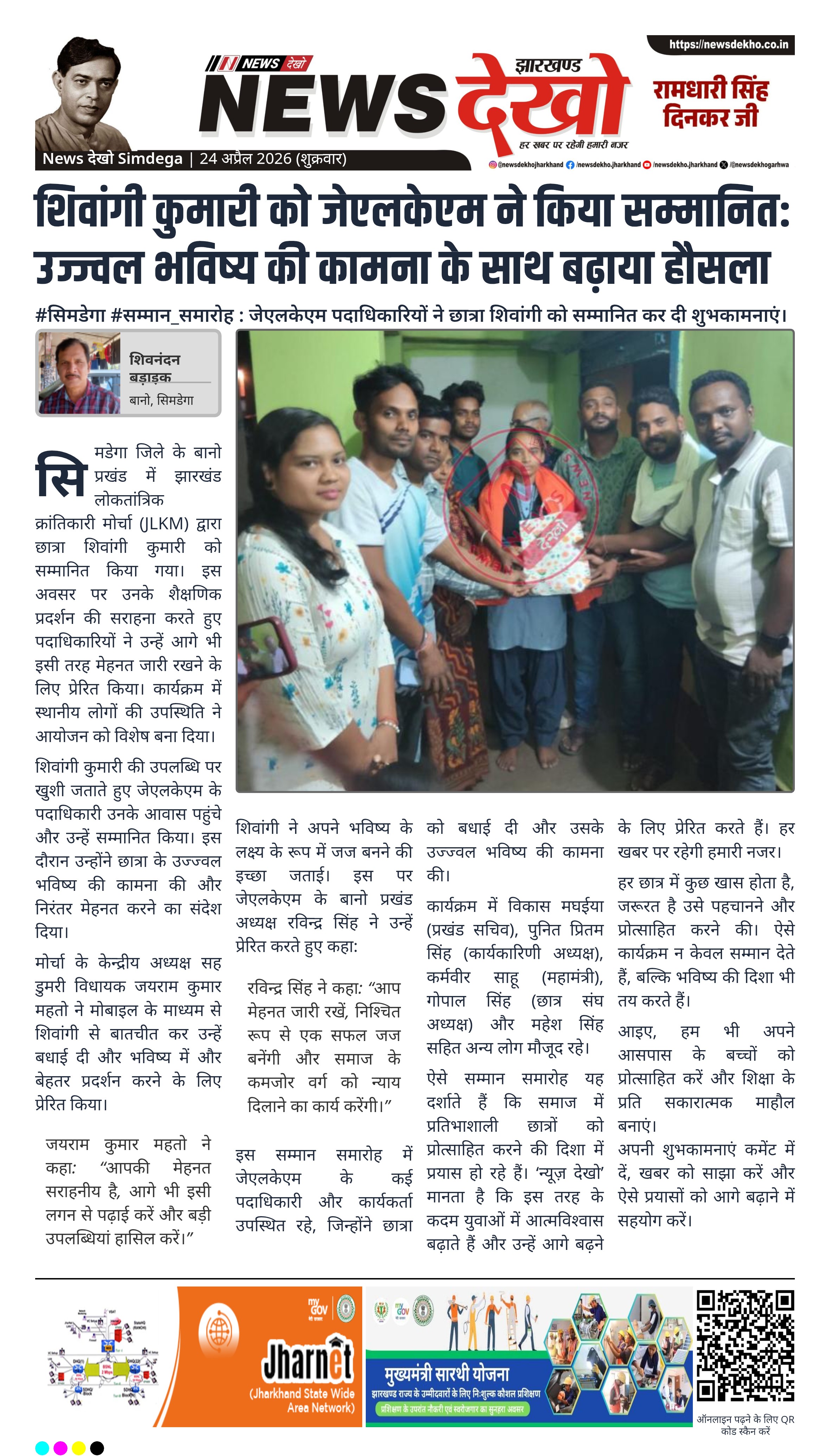 - झारखंड लोकतांत्रिक क्रांतिकारी मोर्चा (JLKM) द्वारा शिवांगी का सम्मान।