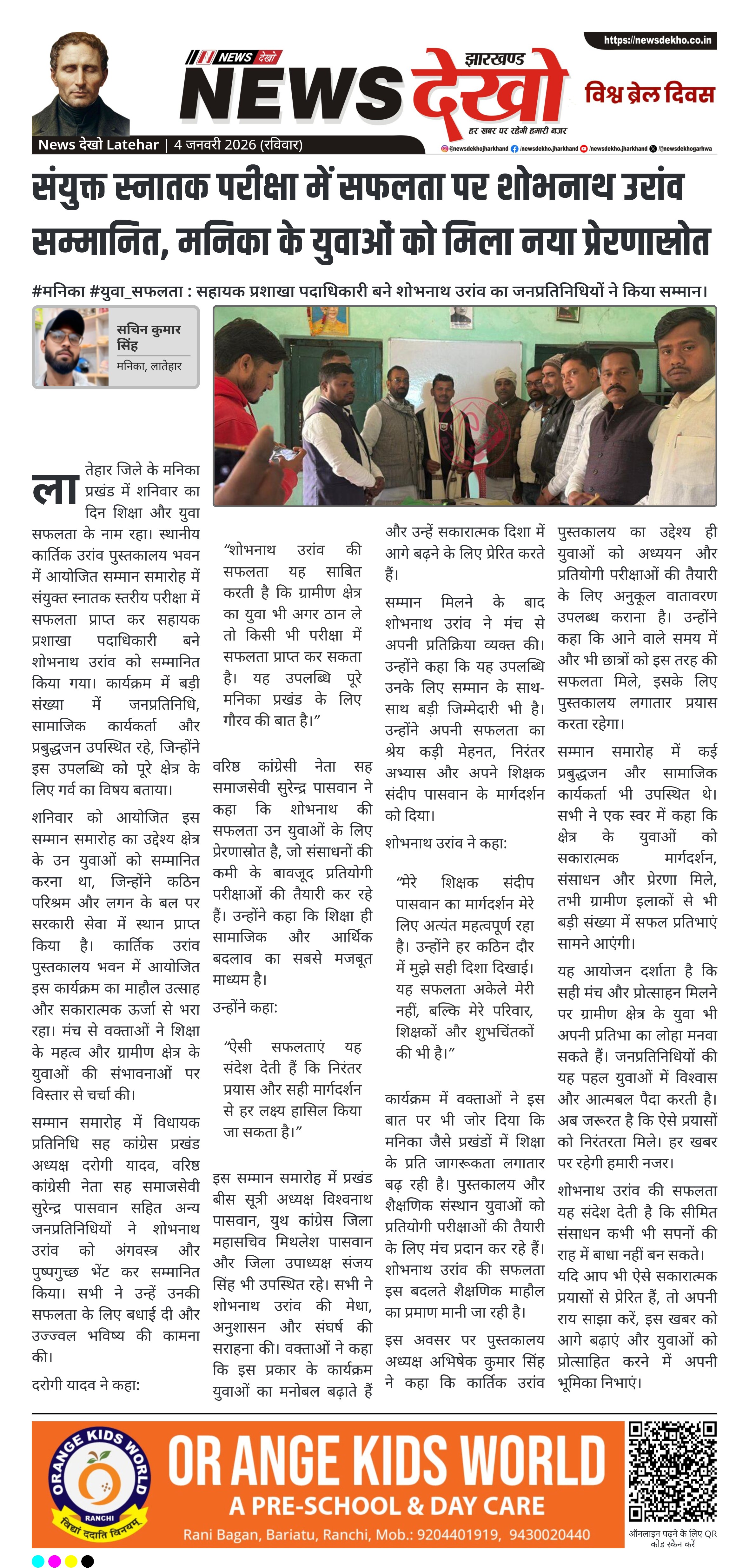 लातेहार जिले के मनिका प्रखंड में शनिवार का दिन शिक्षा और युवा सफलता के नाम रहा। स्थानीय कार्तिक उरांव पुस्तकालय भवन में आयोजित सम्मान समारोह में संयुक्त स्नातक स्तरीय परीक्षा में सफलता प्राप्त कर सहायक प्रशाखा पदाधिकारी बने शोभनाथ उरांव को सम्मानित किया गया। कार्यक्रम में बड़ी संख्या में जनप्रतिनिधि, सामाजिक कार्यकर्ता और प्रबुद्धजन उपस्थित रहे, जिन्होंने इस उपलब्धि को पूरे क्षेत्र के लिए गर्व का विषय बताया।