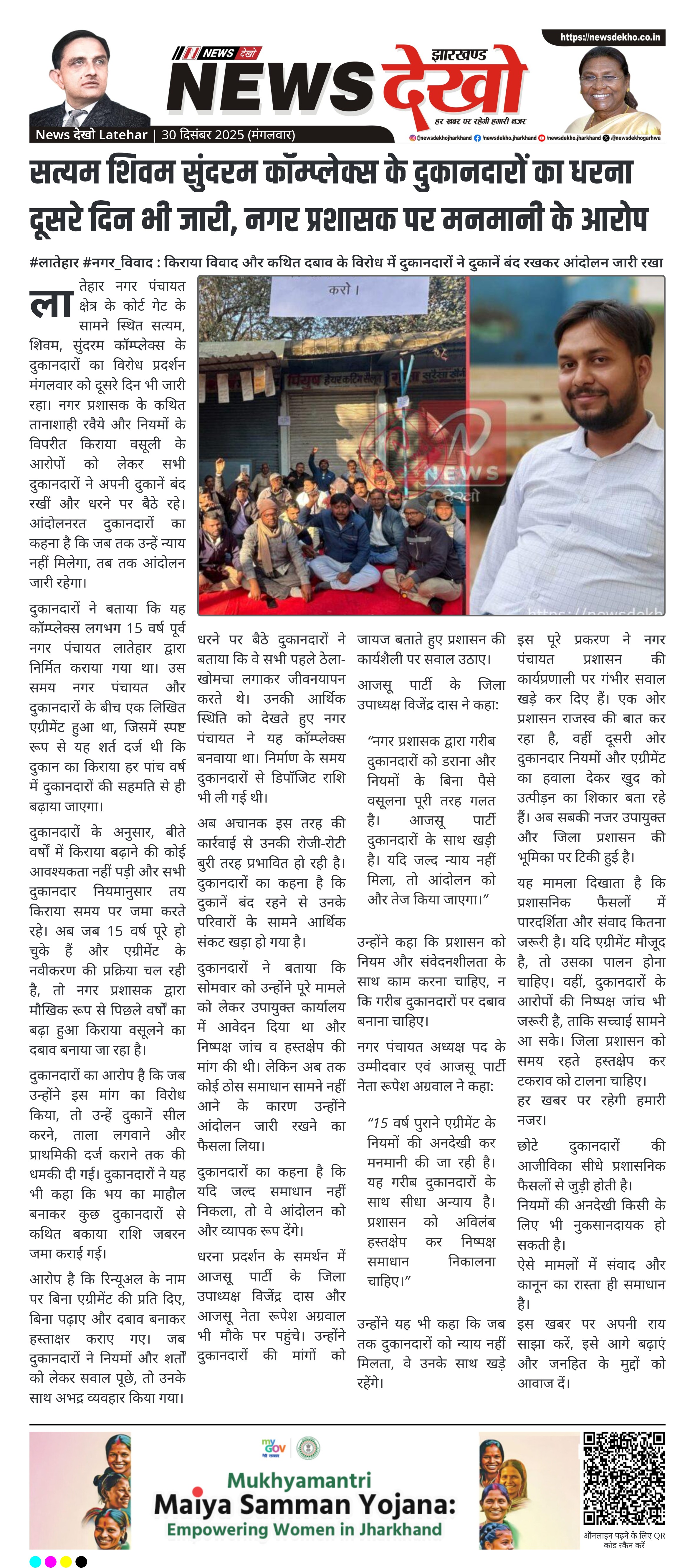 लातेहार नगर पंचायत क्षेत्र के कोर्ट गेट के सामने स्थित सत्यम, शिवम, सुंदरम कॉम्प्लेक्स के दुकानदारों का विरोध प्रदर्शन मंगलवार को दूसरे दिन भी जारी रहा। नगर प्रशासक के कथित तानाशाही रवैये और नियमों के विपरीत किराया वसूली के आरोपों को लेकर सभी दुकानदारों ने अपनी दुकानें बंद रखीं और धरने पर बैठे रहे। आंदोलनरत दुकानदारों का कहना है कि जब तक उन्हें न्याय नहीं मिलेगा, तब तक आंदोलन जारी रहेगा।