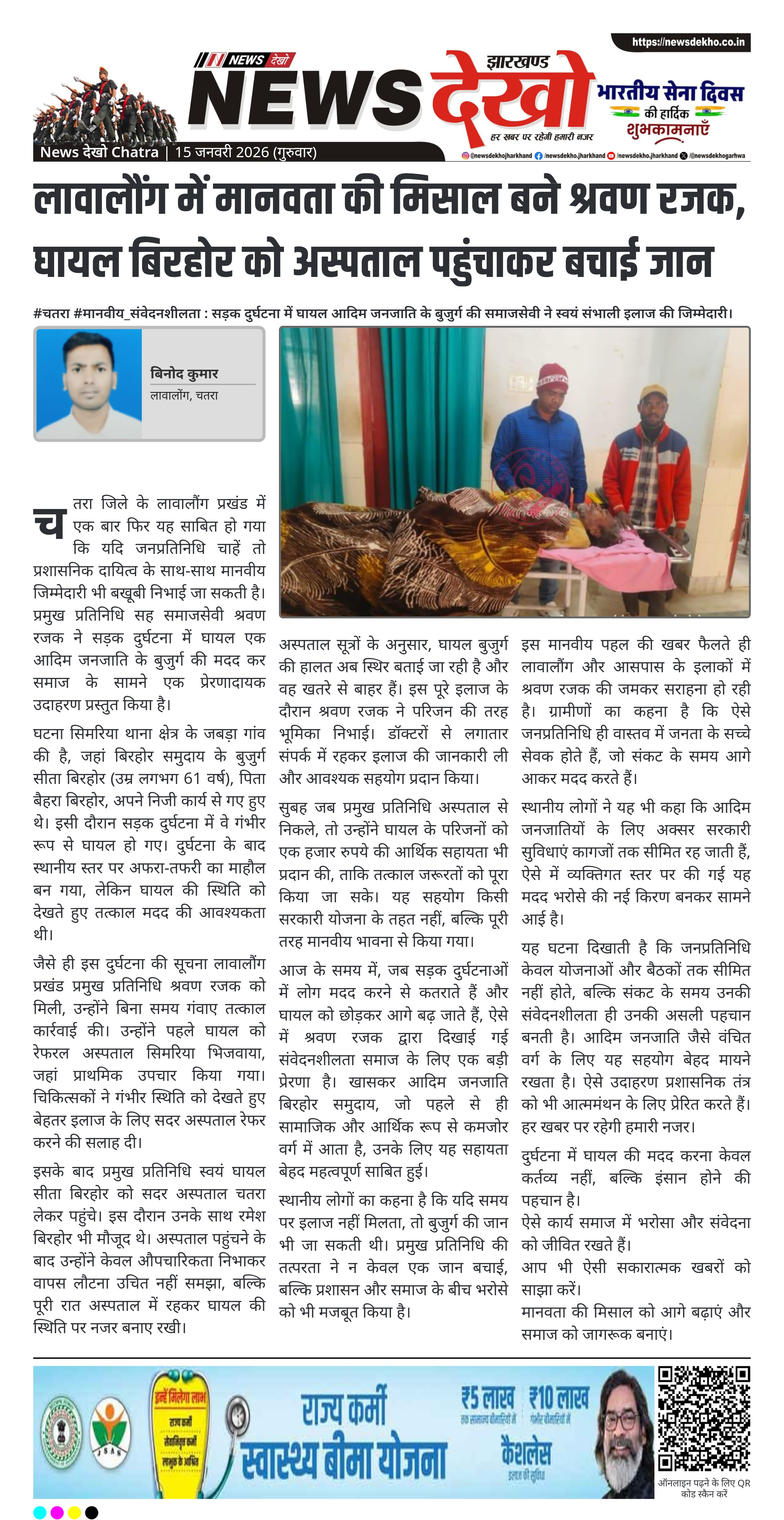 चतरा जिले के लावालौंग प्रखंड में प्रमुख प्रतिनिधि एवं समाजसेवी श्रवण रजक ने मानवता की मिसाल पेश की है। सड़क दुर्घटना में घायल आदिम जनजाति बिरहोर समुदाय के बुजुर्ग को न केवल अस्पताल पहुंचाया गया, बल्कि इलाज के दौरान पूरी रात साथ रहकर देखरेख भी की गई। यह घटना प्रशासनिक जिम्मेदारी से आगे बढ़कर सामाजिक संवेदनशीलता का उदाहरण बनी है। क्षेत्र में इस मानवीय पहल की व्यापक सराहना हो रही है।