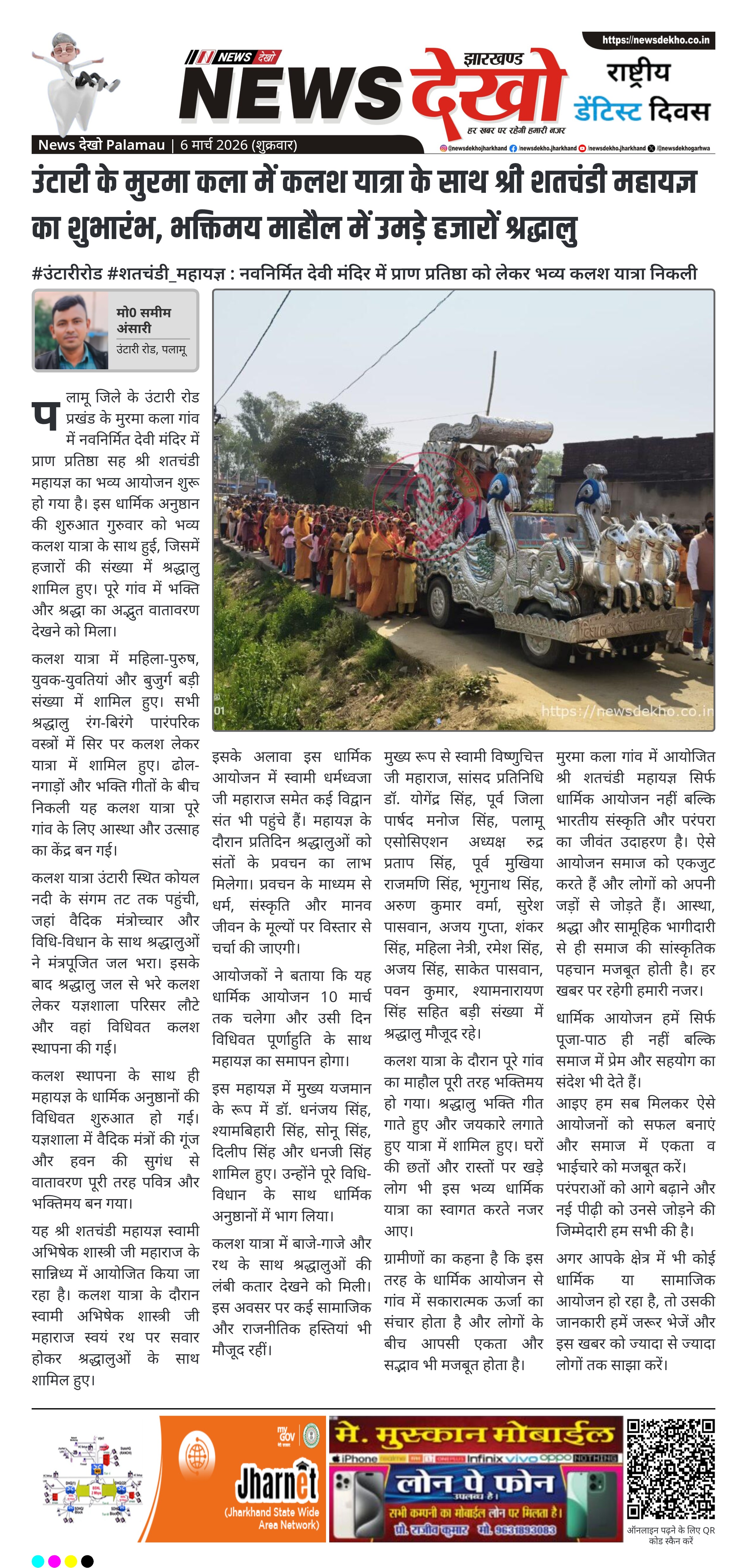 पलामू जिले के उंटारी रोड प्रखंड के मुरमा कला गांव में नवनिर्मित देवी मंदिर में प्राण प्रतिष्ठा सह श्री शतचंडी महायज्ञ का भव्य आयोजन शुरू हो गया है। इस धार्मिक अनुष्ठान की शुरुआत गुरुवार को भव्य कलश यात्रा के साथ हुई, जिसमें हजारों की संख्या में श्रद्धालु शामिल हुए। पूरे गांव में भक्ति और श्रद्धा का अद्भुत वातावरण देखने को मिला।