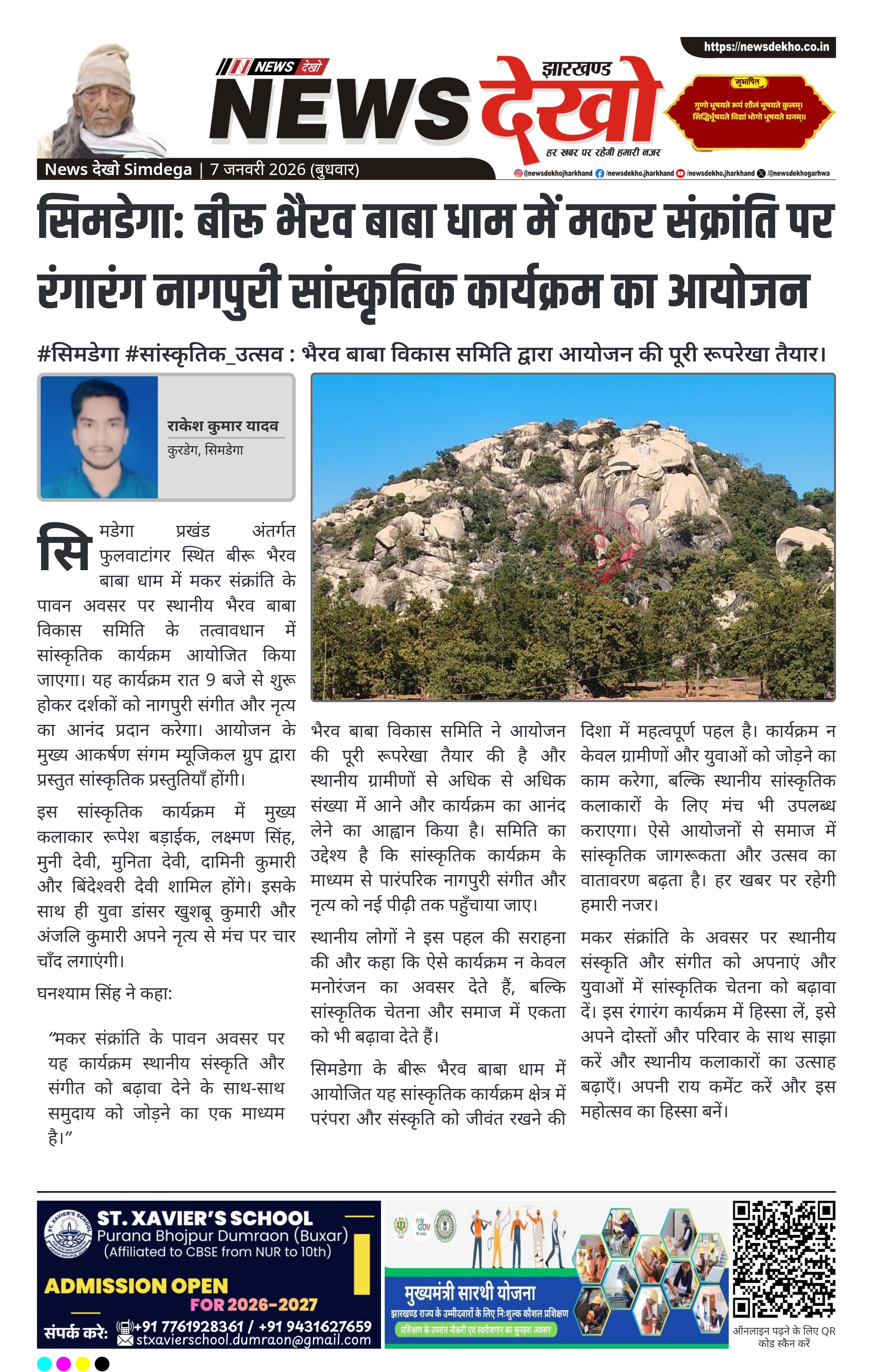 सिमडेगा प्रखंड अंतर्गत फुलवाटांगर स्थित बीरू भैरव बाबा धाम में मकर संक्रांति के पावन अवसर पर स्थानीय भैरव बाबा विकास समिति के तत्वावधान में सांस्कृतिक कार्यक्रम आयोजित किया जाएगा। यह कार्यक्रम रात 9 बजे से शुरू होकर दर्शकों को नागपुरी संगीत और नृत्य का आनंद प्रदान करेगा। आयोजन के मुख्य आकर्षण संगम म्यूजिकल ग्रुप द्वारा प्रस्तुत सांस्कृतिक प्रस्तुतियाँ होंगी।