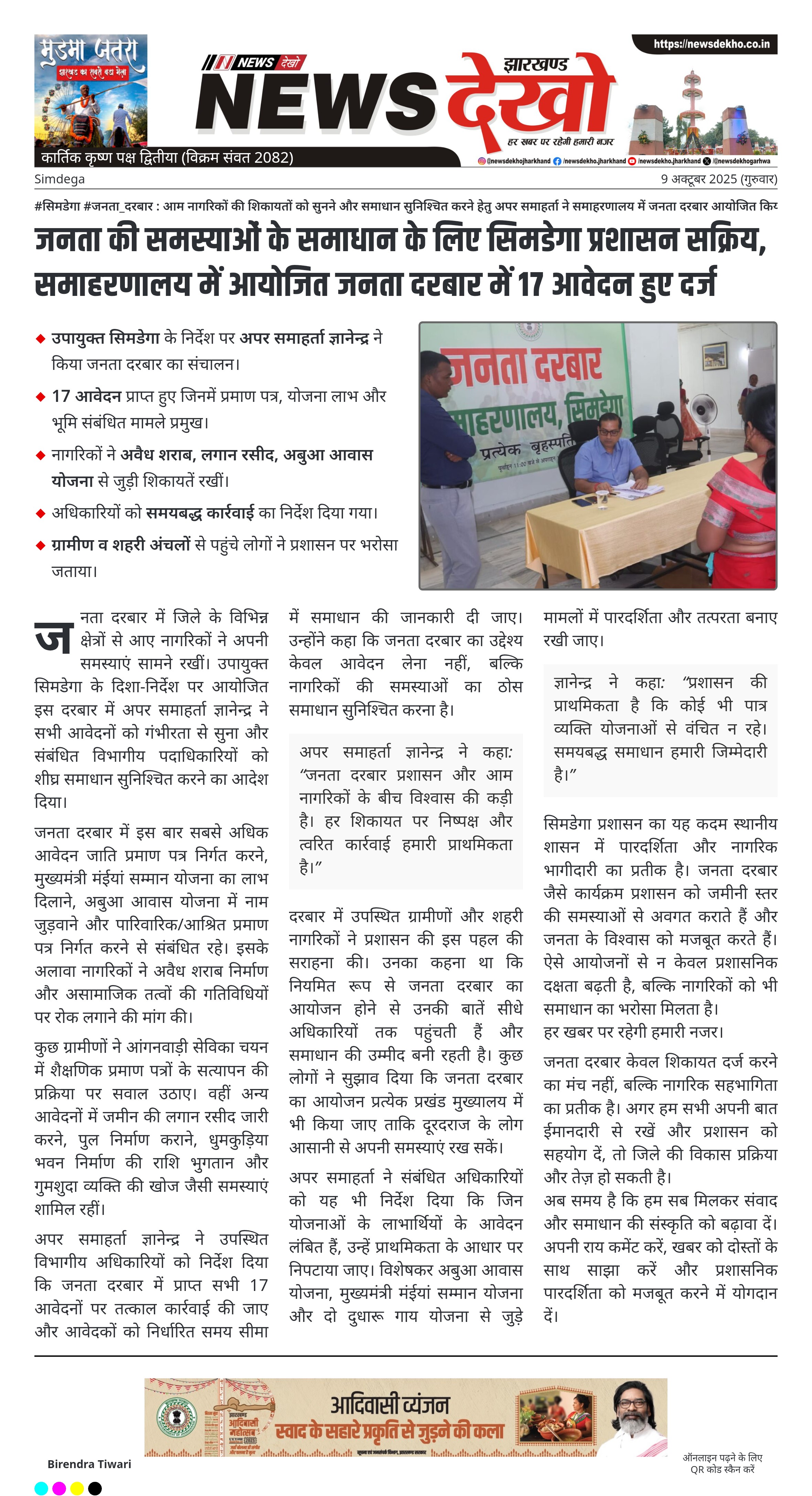 सिमडेगा प्रशासन का यह कदम स्थानीय शासन में पारदर्शिता और नागरिक भागीदारी का प्रतीक है। जनता दरबार जैसे कार्यक्रम प्रशासन को जमीनी स्तर की समस्याओं से अवगत कराते हैं और जनता के विश्वास को मजबूत करते हैं। ऐसे आयोजनों से न केवल प्रशासनिक दक्षता बढ़ती है, बल्कि नागरिकों को भी समाधान का भरोसा मिलता है।