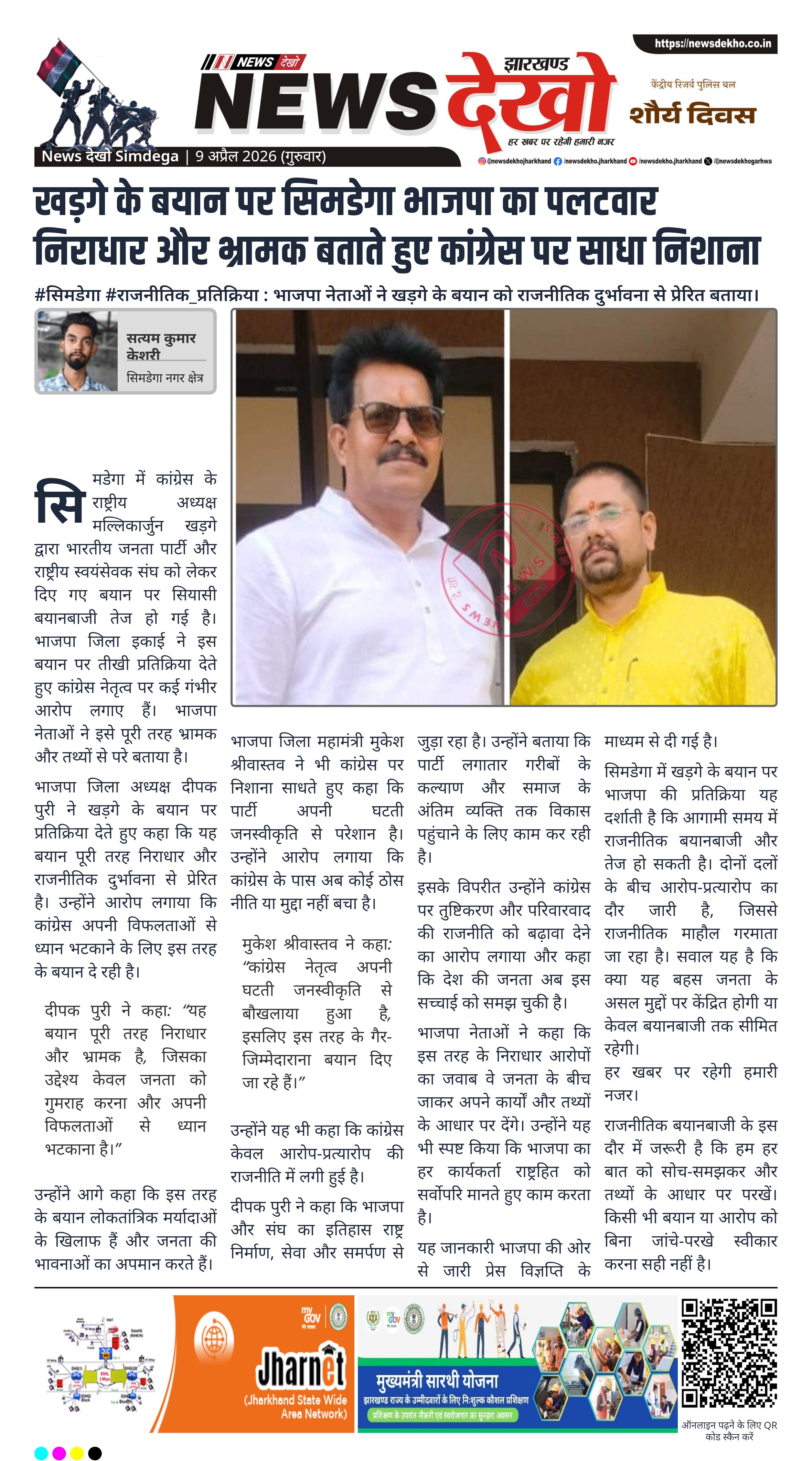 सिमडेगा में कांग्रेस अध्यक्ष मल्लिकार्जुन खड़गे के बयान पर भाजपा नेताओं ने कड़ी प्रतिक्रिया दी है। भाजपा जिला अध्यक्ष दीपक पुरी और महामंत्री मुकेश श्रीवास्तव ने बयान को निराधार और भ्रामक बताते हुए कांग्रेस पर आरोप लगाए। उन्होंने इसे राजनीतिक दुर्भावना से प्रेरित करार देते हुए जनता को गुमराह करने की कोशिश बताया।