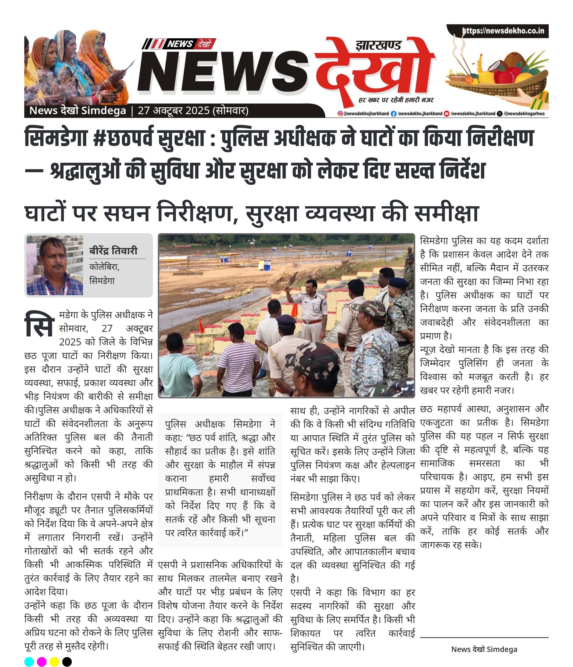 • सिमडेगा पुलिस अधीक्षक ने 27 अक्टूबर 2025 को जिले के सभी छठ घाटों का औचक निरीक्षण किया।