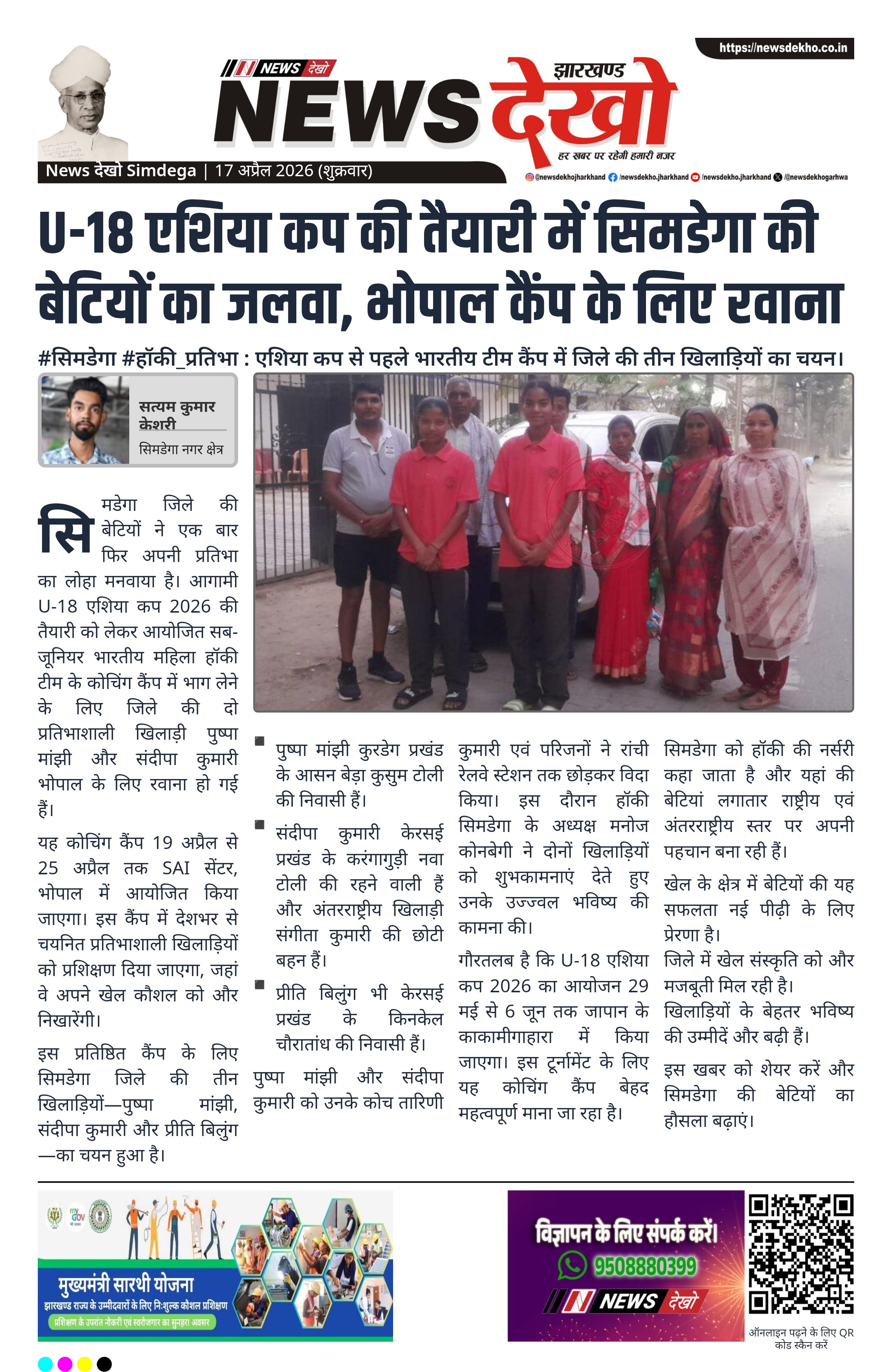 इस प्रतिष्ठित कैंप के लिए सिमडेगा जिले की तीन खिलाड़ियों—पुष्पा मांझी, संदीपा कुमारी और प्रीति बिलुंग—का चयन हुआ है।