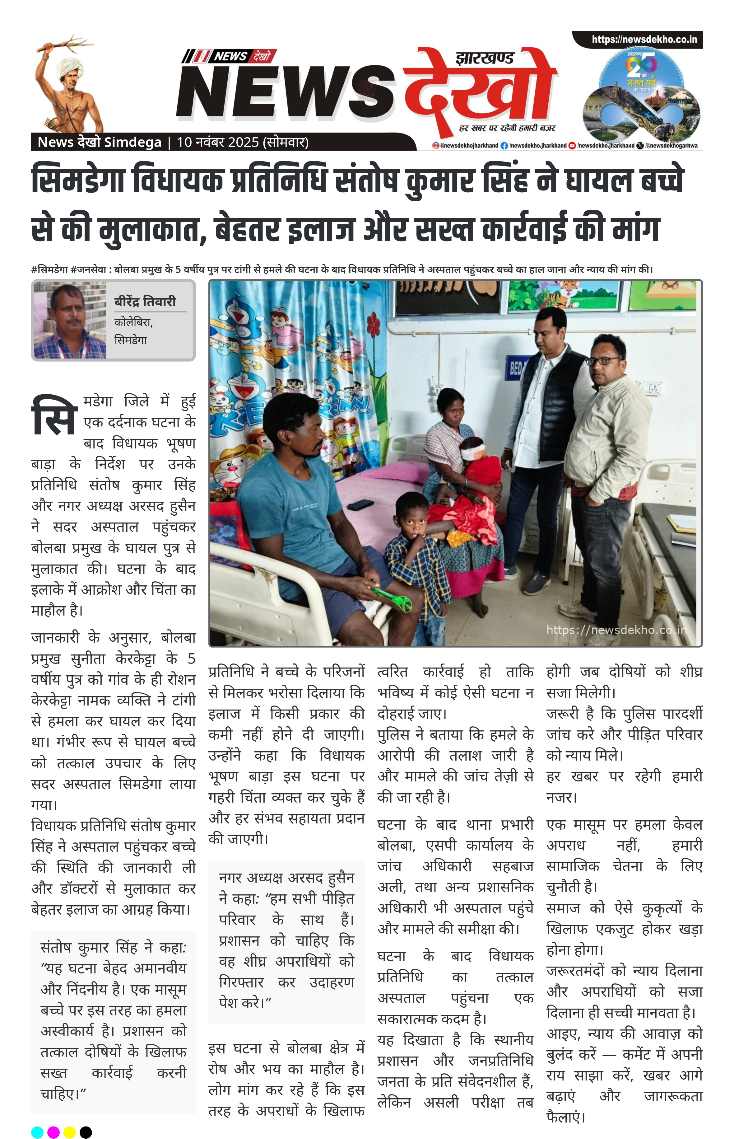 सिमडेगा जिले में हुई एक दर्दनाक घटना के बाद विधायक भूषण बाड़ा के निर्देश पर उनके प्रतिनिधि संतोष कुमार सिंह और नगर अध्यक्ष अरसद हुसैन ने सदर अस्पताल पहुंचकर बोलबा प्रमुख के घायल पुत्र से मुलाकात की। घटना के बाद इलाके में आक्रोश और चिंता का माहौल है।