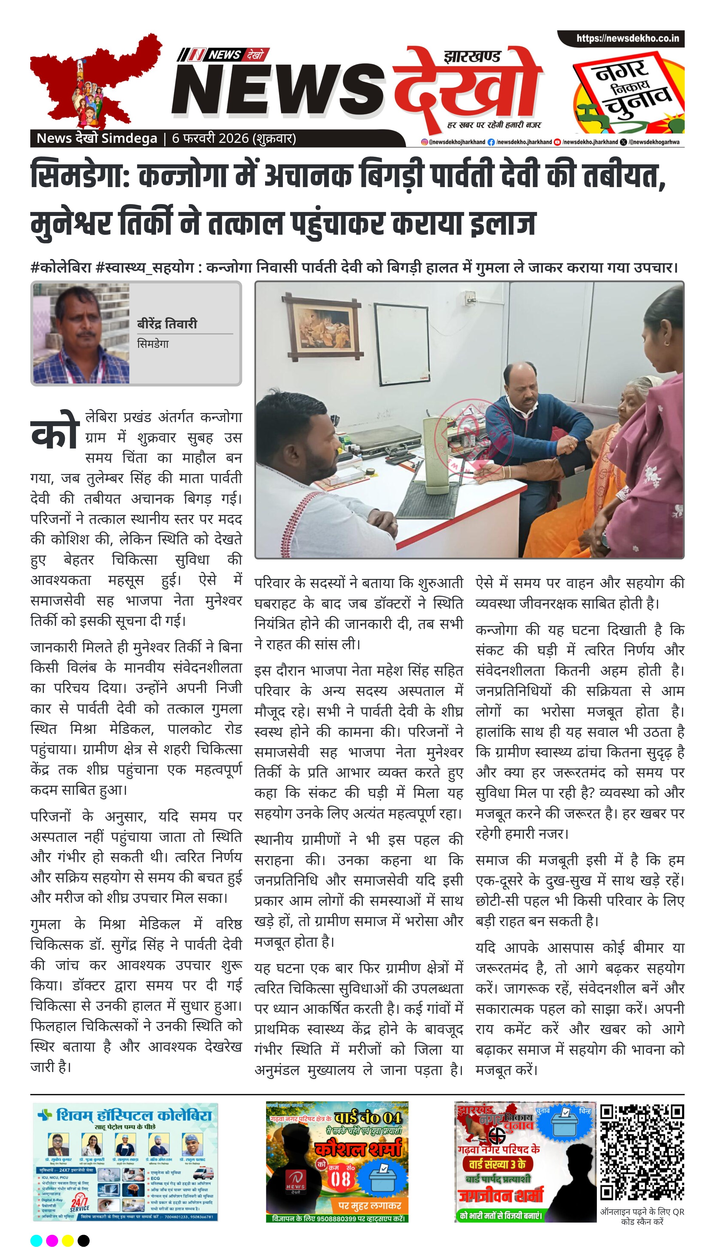 कोलेबिरा प्रखंड अंतर्गत कन्जोगा ग्राम में शुक्रवार सुबह उस समय चिंता का माहौल बन गया, जब तुलेम्बर सिंह की माता पार्वती देवी की तबीयत अचानक बिगड़ गई। परिजनों ने तत्काल स्थानीय स्तर पर मदद की कोशिश की, लेकिन स्थिति को देखते हुए बेहतर चिकित्सा सुविधा की आवश्यकता महसूस हुई। ऐसे में समाजसेवी सह भाजपा नेता मुनेश्वर तिर्की को इसकी सूचना दी गई।
