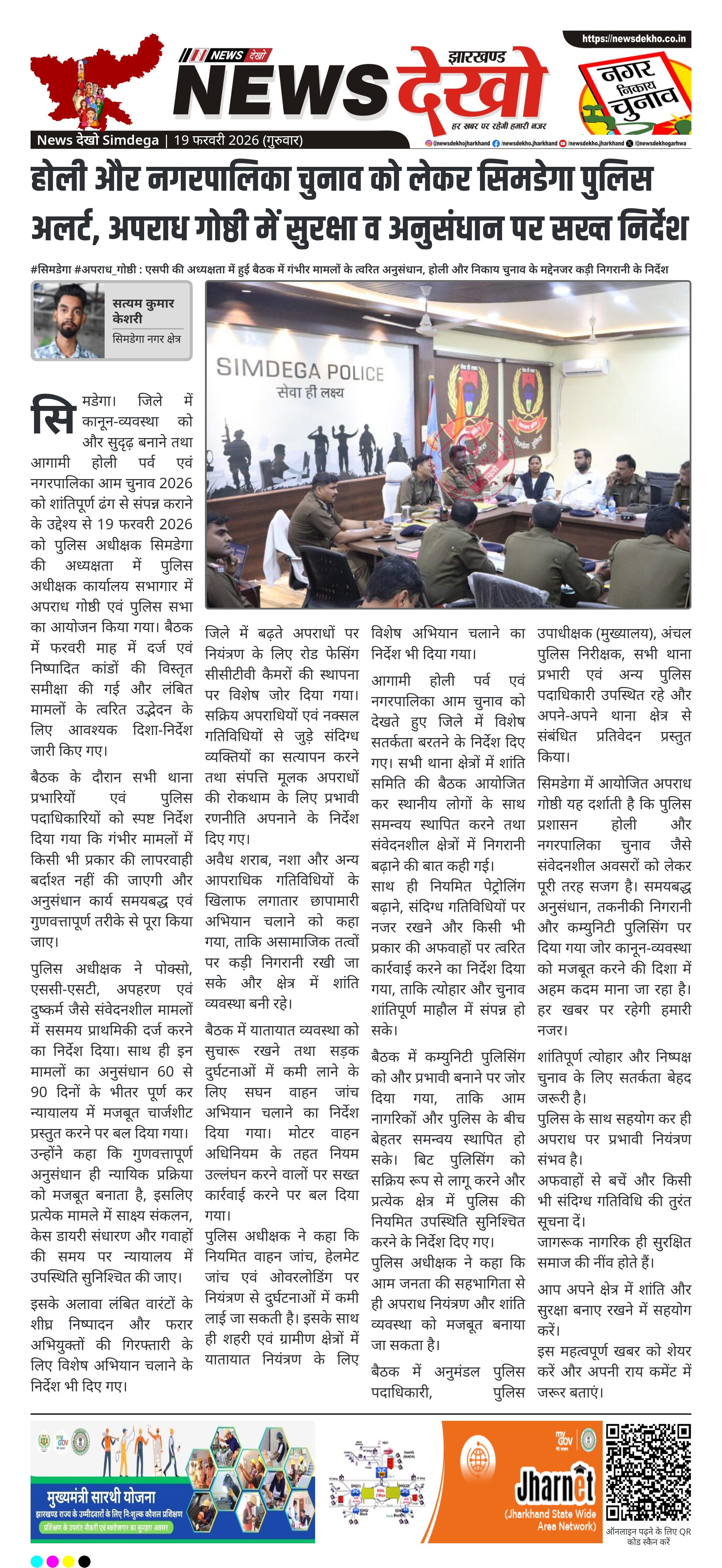 सिमडेगा पुलिस अधीक्षक की अध्यक्षता में 19 फरवरी 2026 को अपराध गोष्ठी एवं पुलिस सभा का आयोजन किया गया, जिसमें लंबित कांडों की समीक्षा, कानून-व्यवस्था सुदृढ़ करने और होली व नगरपालिका चुनाव को लेकर विशेष सतर्कता पर जोर दिया गया। बैठक में अनुसंधान, पेट्रोलिंग और अपराध नियंत्रण से जुड़े कई महत्वपूर्ण निर्देश जारी किए गए।