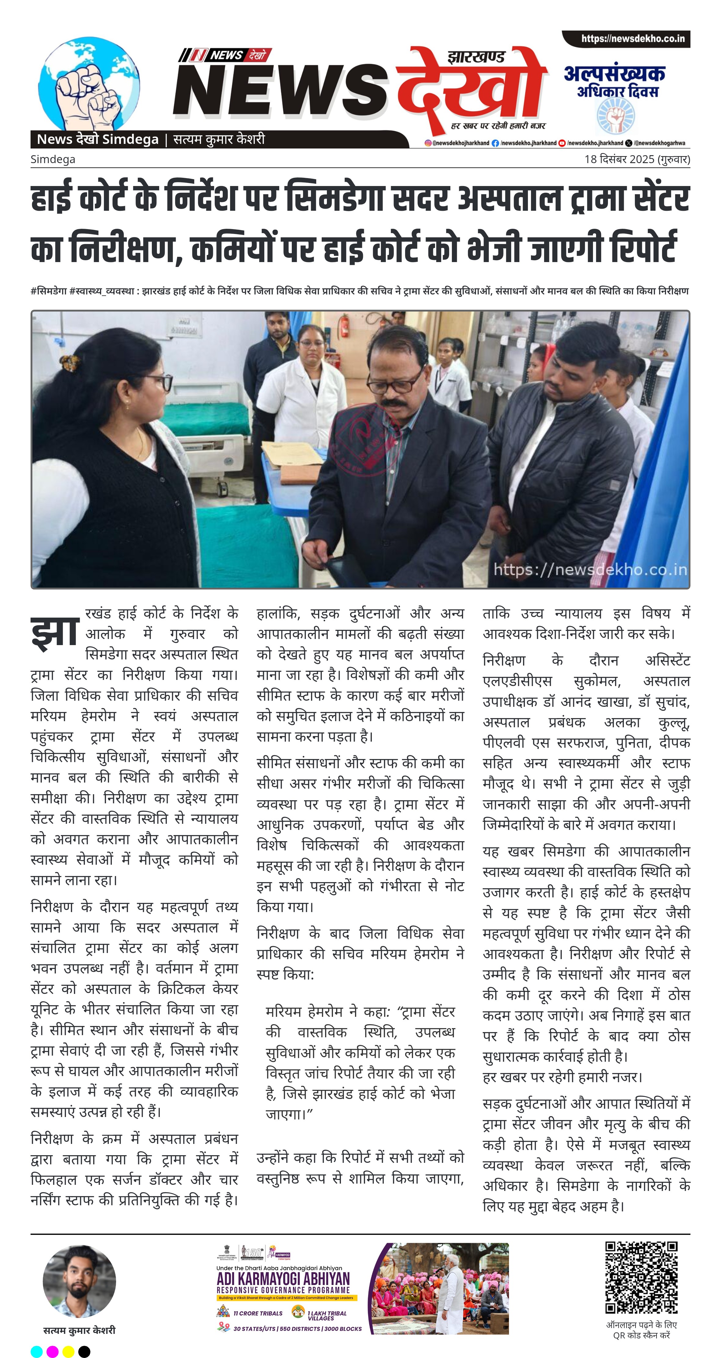 झारखंड हाई कोर्ट के निर्देश के आलोक में गुरुवार को सिमडेगा सदर अस्पताल स्थित ट्रामा सेंटर का निरीक्षण किया गया। जिला विधिक सेवा प्राधिकार की सचिव मरियम हेमरोम ने स्वयं अस्पताल पहुंचकर ट्रामा सेंटर में उपलब्ध चिकित्सीय सुविधाओं, संसाधनों और मानव बल की स्थिति की बारीकी से समीक्षा की। निरीक्षण का उद्देश्य ट्रामा सेंटर की वास्तविक स्थिति से न्यायालय को अवगत कराना और आपातकालीन स्वास्थ्य सेवाओं में मौजूद कमियों को सामने लाना रहा।