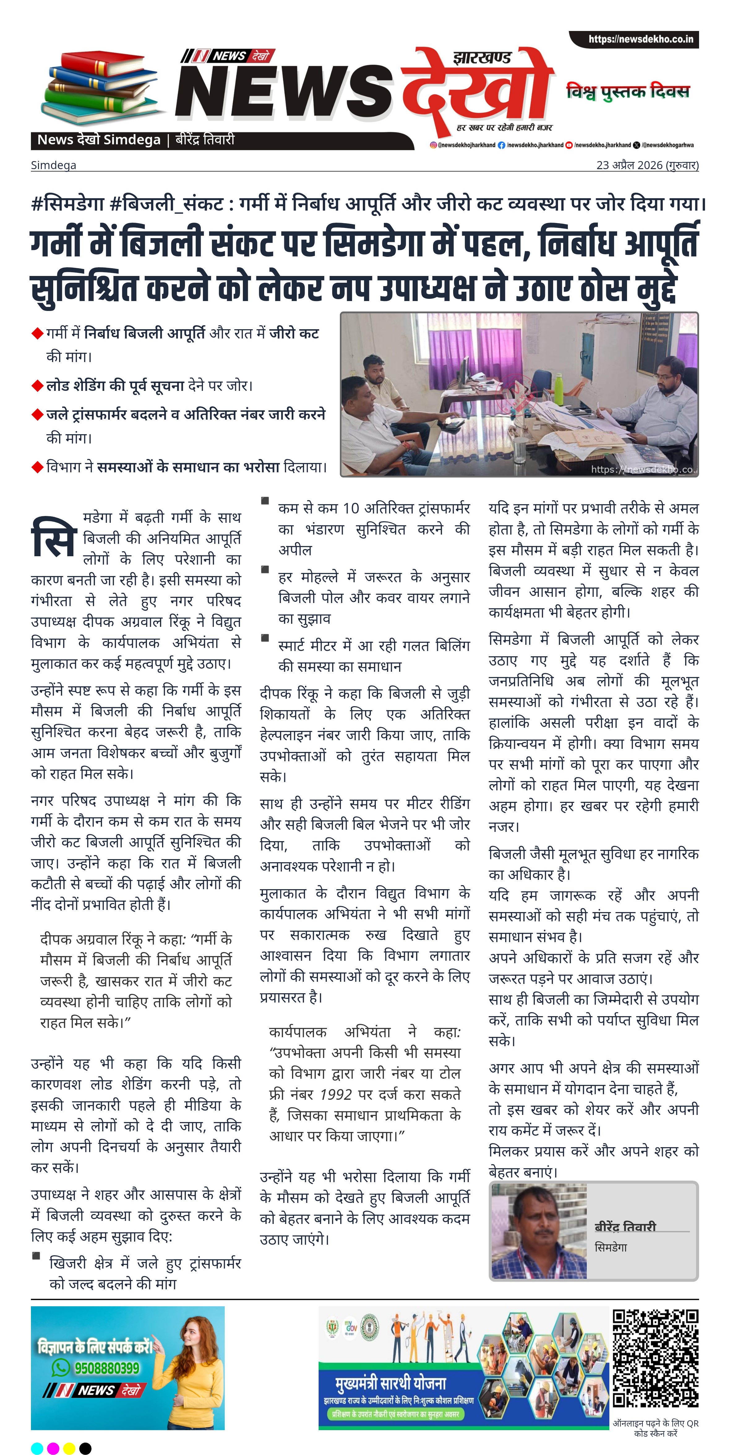 यदि इन मांगों पर प्रभावी तरीके से अमल होता है, तो सिमडेगा के लोगों को गर्मी के इस मौसम में बड़ी राहत मिल सकती है। बिजली व्यवस्था में सुधार से न केवल जीवन आसान होगा, बल्कि शहर की कार्यक्षमता भी बेहतर होगी।
