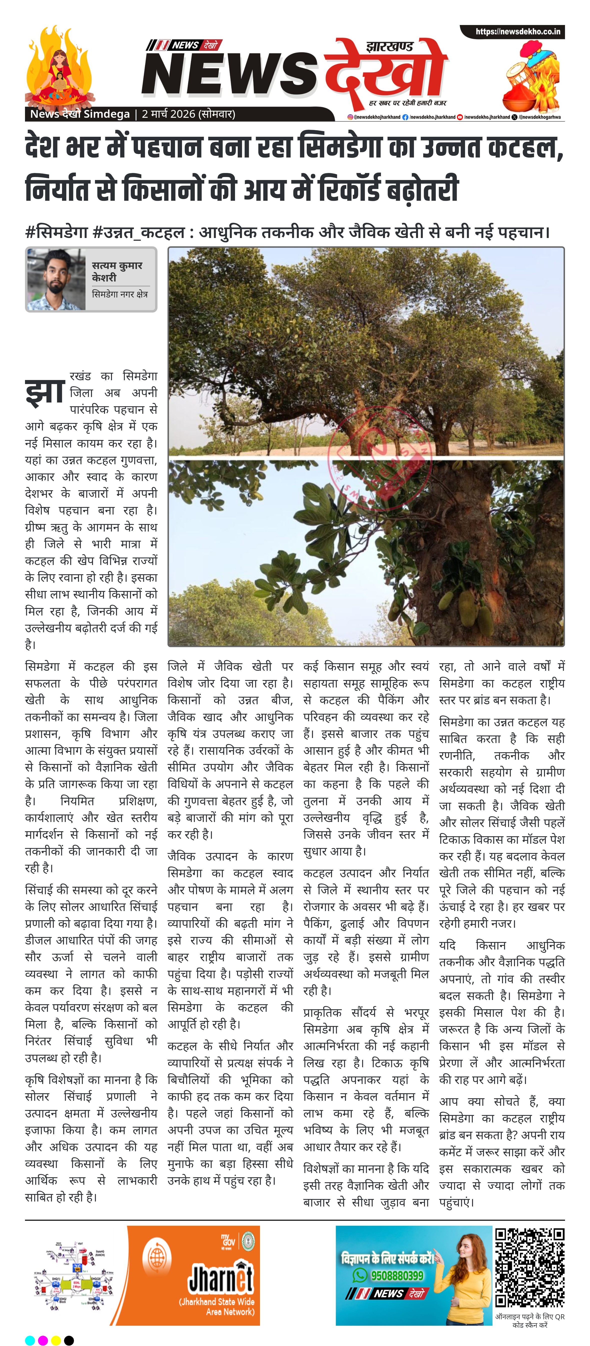 सिमडेगा का उन्नत कटहल यह साबित करता है कि सही रणनीति, तकनीक और सरकारी सहयोग से ग्रामीण अर्थव्यवस्था को नई दिशा दी जा सकती है। जैविक खेती और सोलर सिंचाई जैसी पहलें टिकाऊ विकास का मॉडल पेश कर रही हैं। यह बदलाव केवल खेती तक सीमित नहीं, बल्कि पूरे जिले की पहचान को नई ऊंचाई दे रहा है। हर खबर पर रहेगी हमारी नजर।