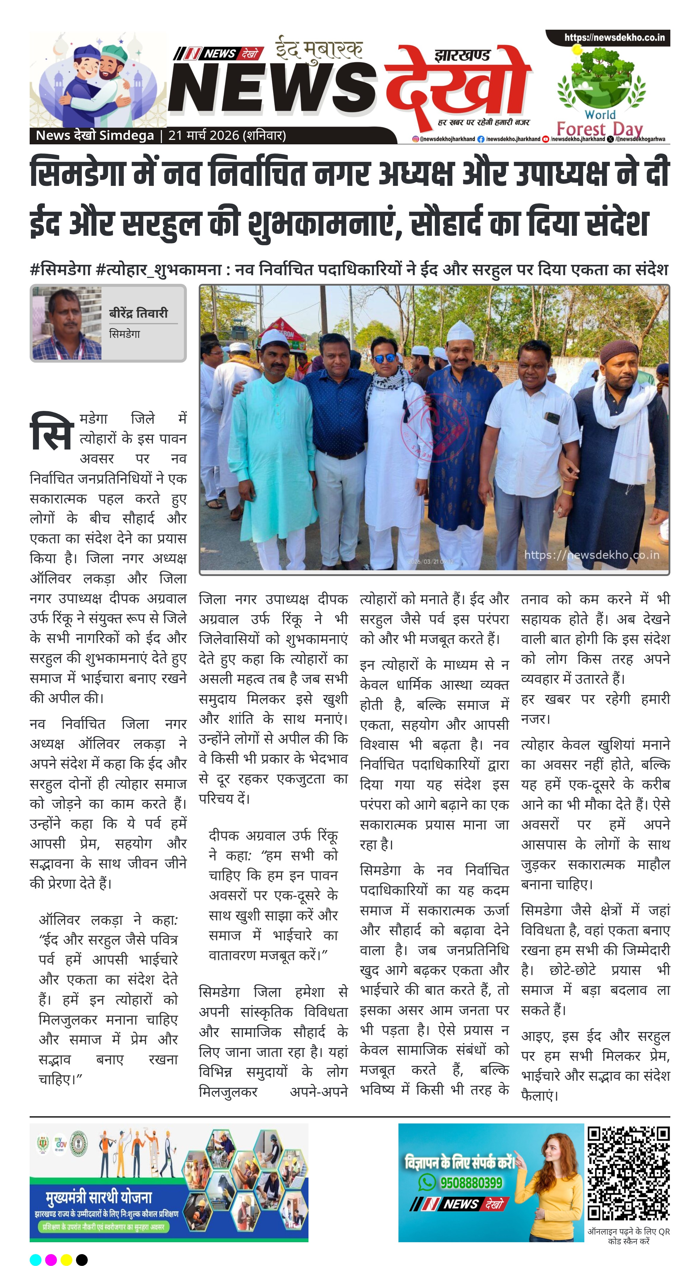 सिमडेगा जिले में त्योहारों के इस पावन अवसर पर नव निर्वाचित जनप्रतिनिधियों ने एक सकारात्मक पहल करते हुए लोगों के बीच सौहार्द और एकता का संदेश देने का प्रयास किया है। जिला नगर अध्यक्ष ऑलिवर लकड़ा और जिला नगर उपाध्यक्ष दीपक अग्रवाल उर्फ रिंकू ने संयुक्त रूप से जिले के सभी नागरिकों को ईद और सरहुल की शुभकामनाएं देते हुए समाज में भाईचारा बनाए रखने की अपील की।