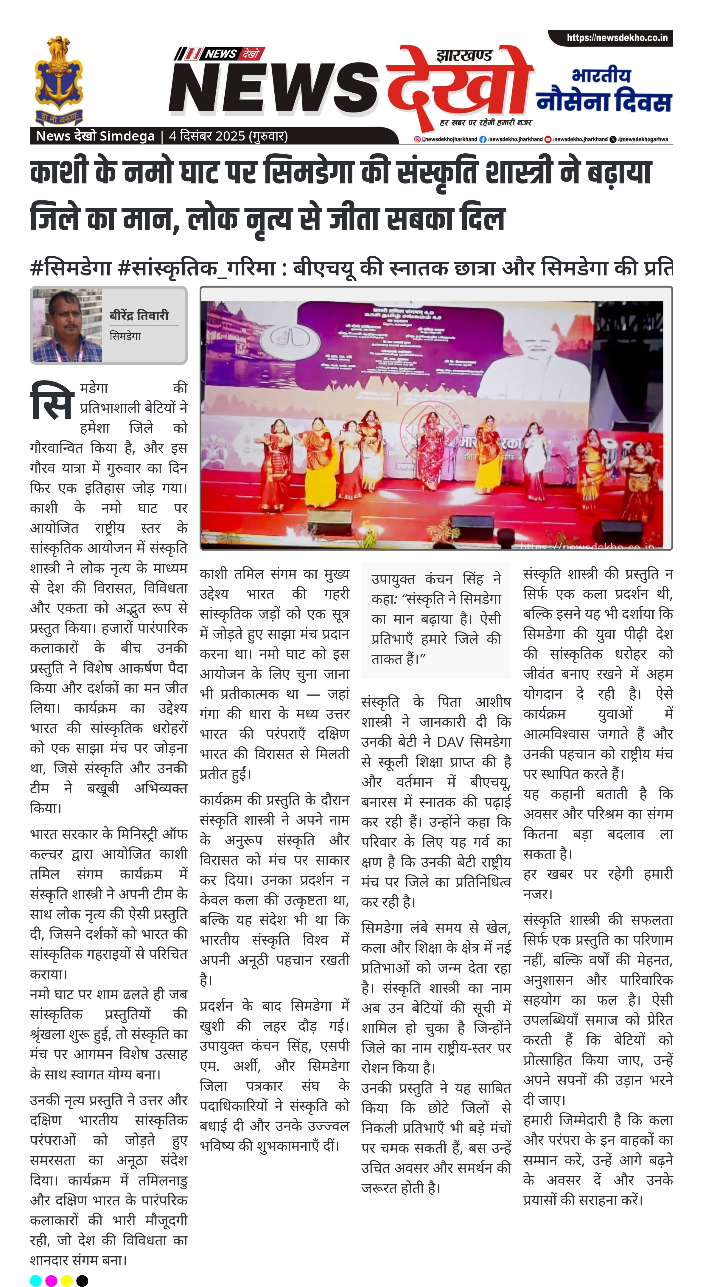 - संस्कृति शास्त्री, सिमडेगा की बेटी, ने काशी के नमो घाट पर लोक नृत्य की बेहतरीन प्रस्तुति दी।