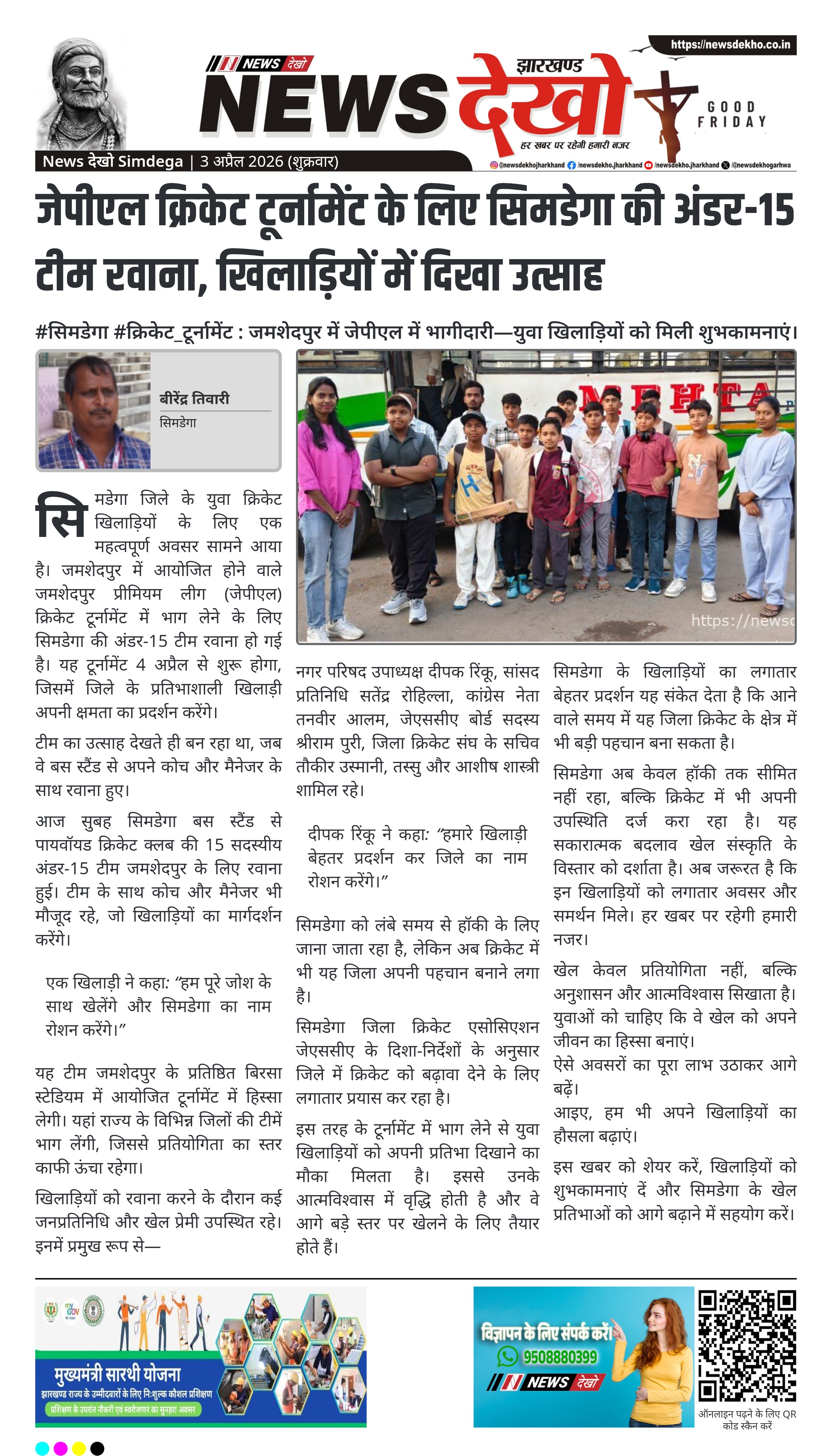 सिमडेगा जिले के युवा क्रिकेट खिलाड़ियों के लिए एक महत्वपूर्ण अवसर सामने आया है। जमशेदपुर में आयोजित होने वाले जमशेदपुर प्रीमियम लीग (जेपीएल) क्रिकेट टूर्नामेंट में भाग लेने के लिए सिमडेगा की अंडर-15 टीम रवाना हो गई है। यह टूर्नामेंट 4 अप्रैल से शुरू होगा, जिसमें जिले के प्रतिभाशाली खिलाड़ी अपनी क्षमता का प्रदर्शन करेंगे।