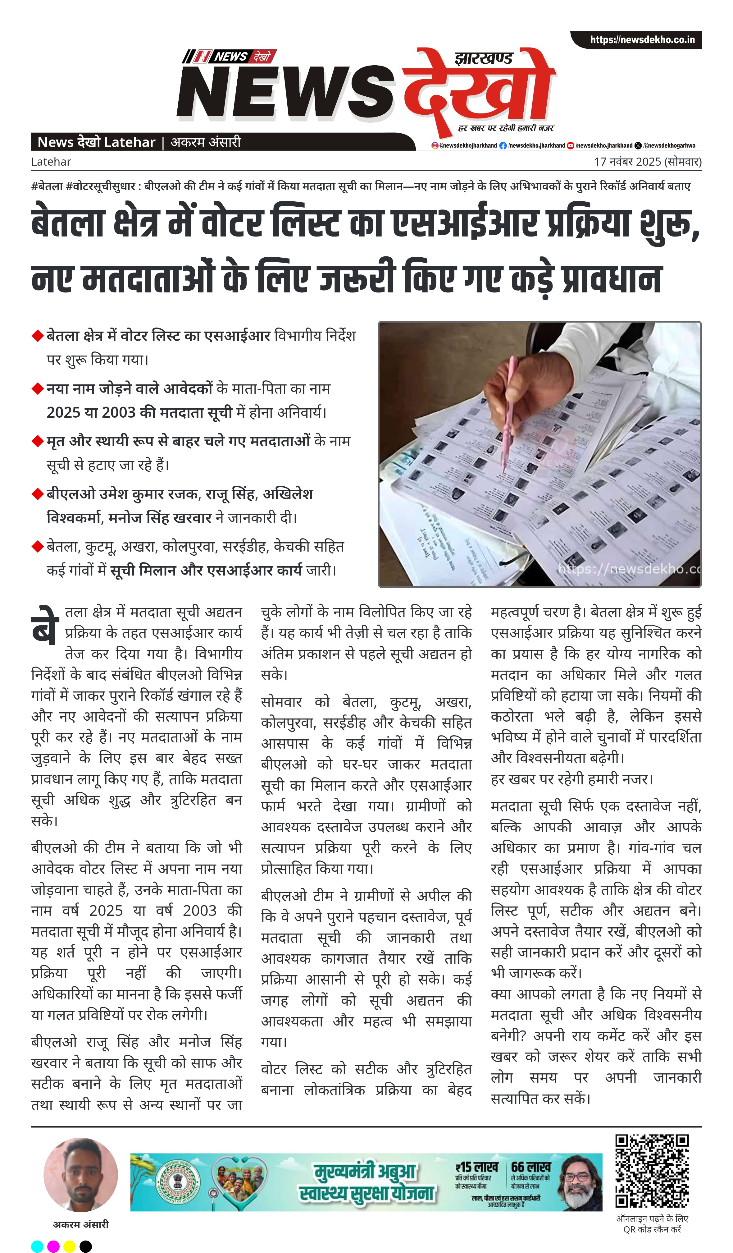 वोटर लिस्ट को सटीक और त्रुटिरहित बनाना लोकतांत्रिक प्रक्रिया का बेहद महत्वपूर्ण चरण है। बेतला क्षेत्र में शुरू हुई एसआईआर प्रक्रिया यह सुनिश्चित करने का प्रयास है कि हर योग्य नागरिक को मतदान का अधिकार मिले और गलत प्रविष्टियों को हटाया जा सके। नियमों की कठोरता भले बढ़ी है, लेकिन इससे भविष्य में होने वाले चुनावों में पारदर्शिता और विश्वसनीयता बढ़ेगी।
