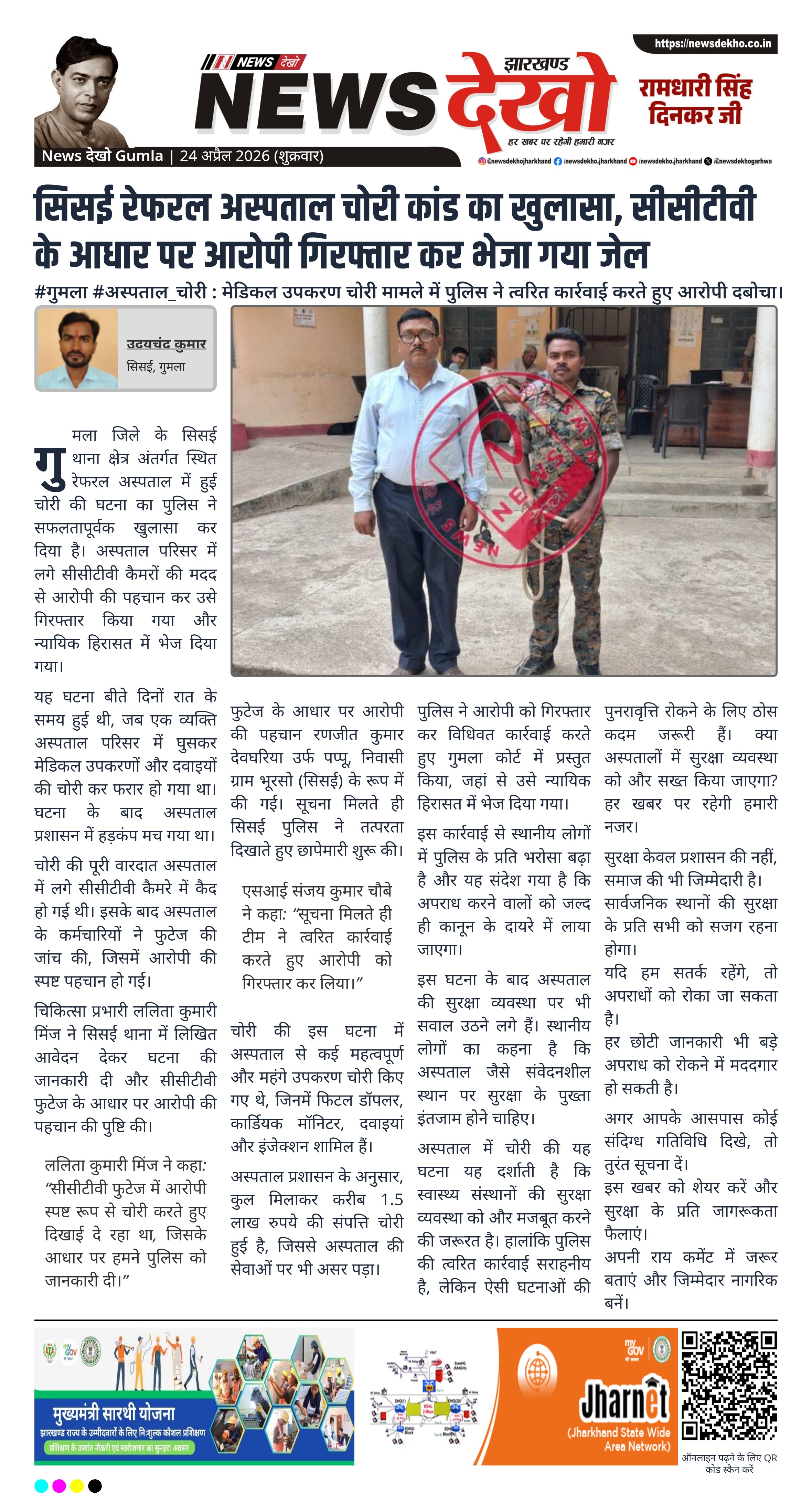 गुमला जिले के सिसई थाना क्षेत्र अंतर्गत स्थित रेफरल अस्पताल में हुई चोरी की घटना का पुलिस ने सफलतापूर्वक खुलासा कर दिया है। अस्पताल परिसर में लगे सीसीटीवी कैमरों की मदद से आरोपी की पहचान कर उसे गिरफ्तार किया गया और न्यायिक हिरासत में भेज दिया गया।