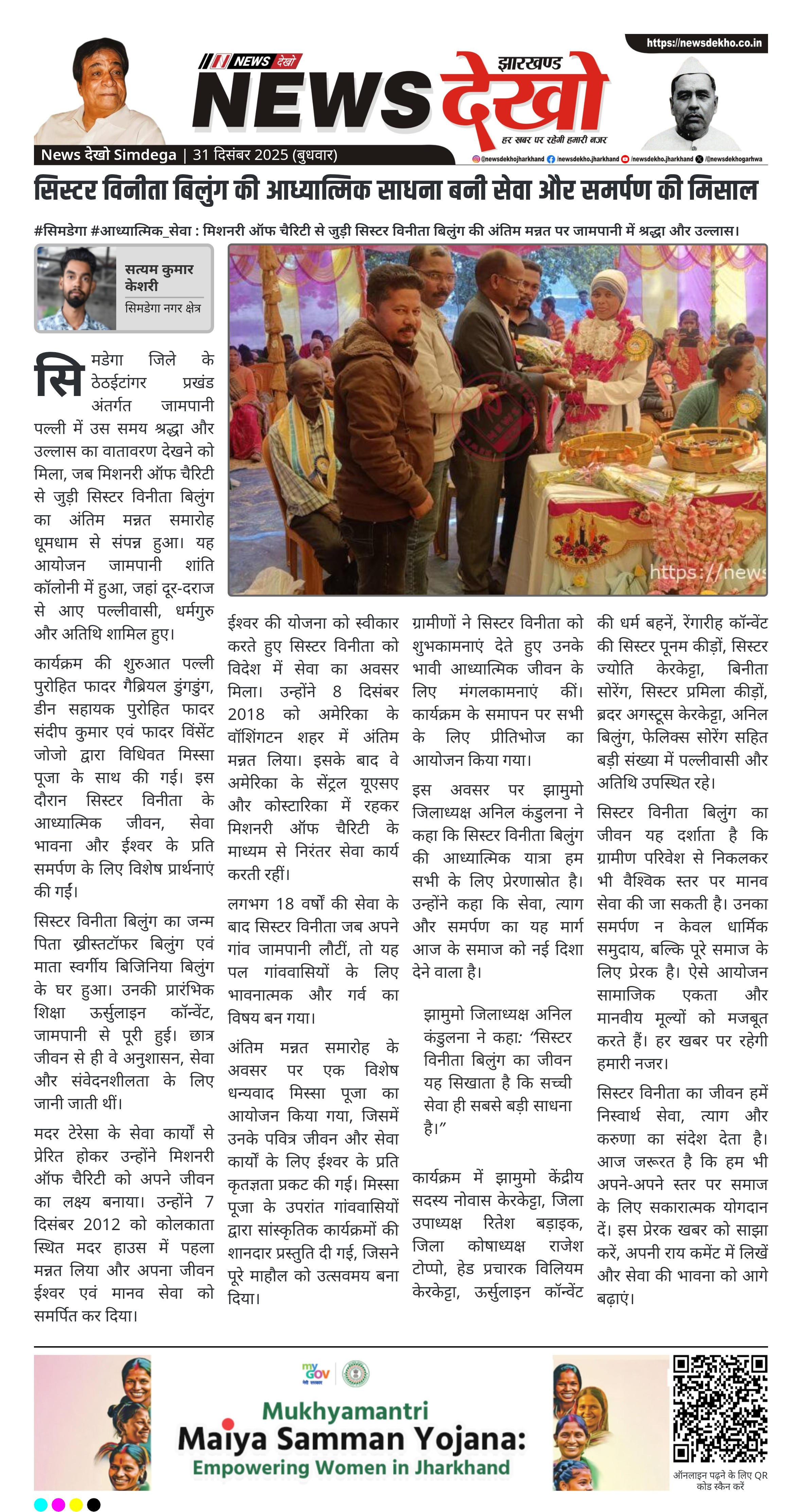 सिस्टर विनीता बिलुंग का जीवन यह दर्शाता है कि ग्रामीण परिवेश से निकलकर भी वैश्विक स्तर पर मानव सेवा की जा सकती है। उनका समर्पण न केवल धार्मिक समुदाय, बल्कि पूरे समाज के लिए प्रेरक है। ऐसे आयोजन सामाजिक एकता और मानवीय मूल्यों को मजबूत करते हैं। हर खबर पर रहेगी हमारी नजर।