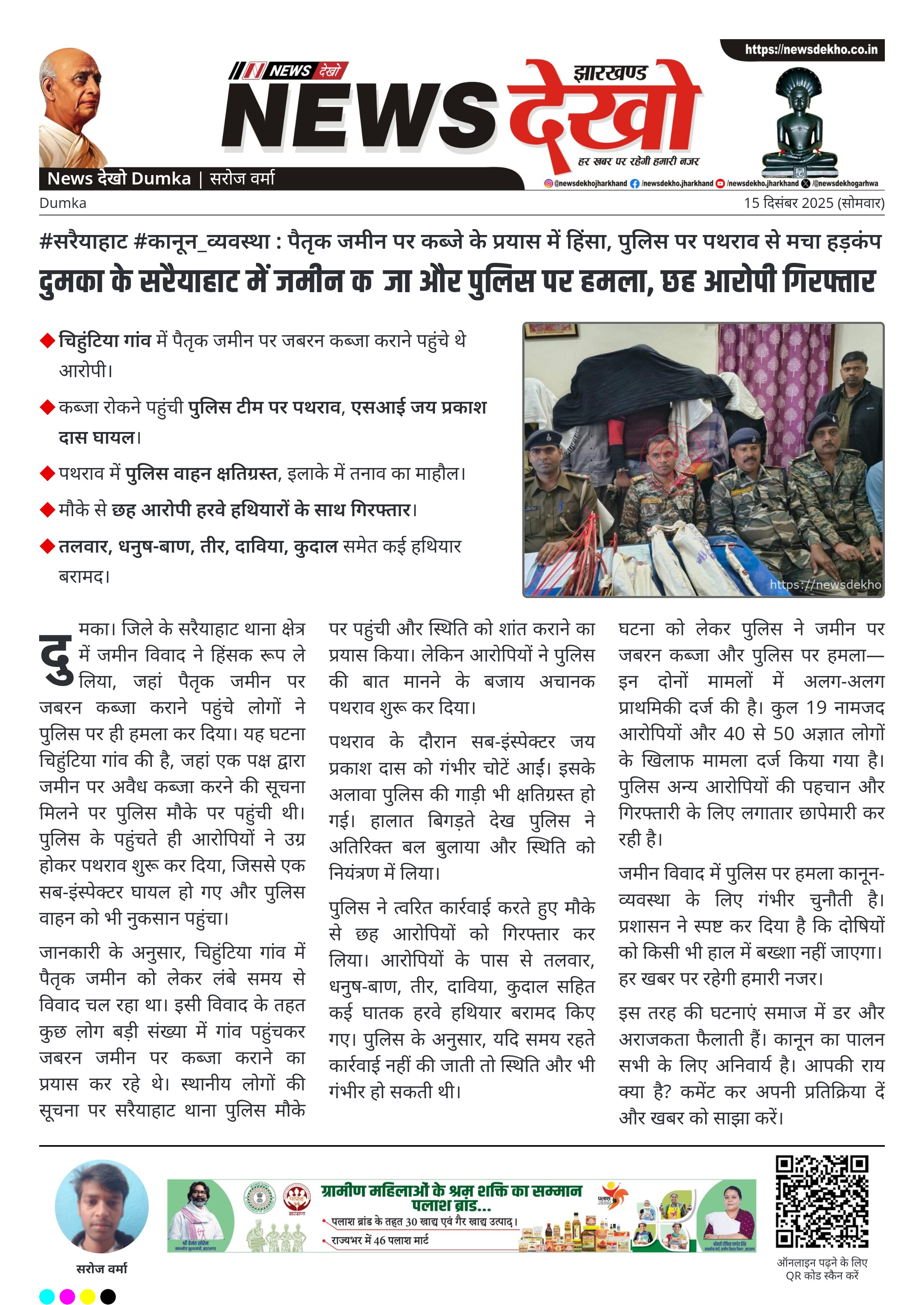 दुमका। जिले के सरैयाहाट थाना क्षेत्र में जमीन विवाद ने हिंसक रूप ले लिया, जहां पैतृक जमीन पर जबरन कब्जा कराने पहुंचे लोगों ने पुलिस पर ही हमला कर दिया। यह घटना चिहुंटिया गांव की है, जहां एक पक्ष द्वारा जमीन पर अवैध कब्जा करने की सूचना मिलने पर पुलिस मौके पर पहुंची थी। पुलिस के पहुंचते ही आरोपियों ने उग्र होकर पथराव शुरू कर दिया, जिससे एक सब-इंस्पेक्टर घायल हो गए और पुलिस वाहन को भी नुकसान पहुंचा।
