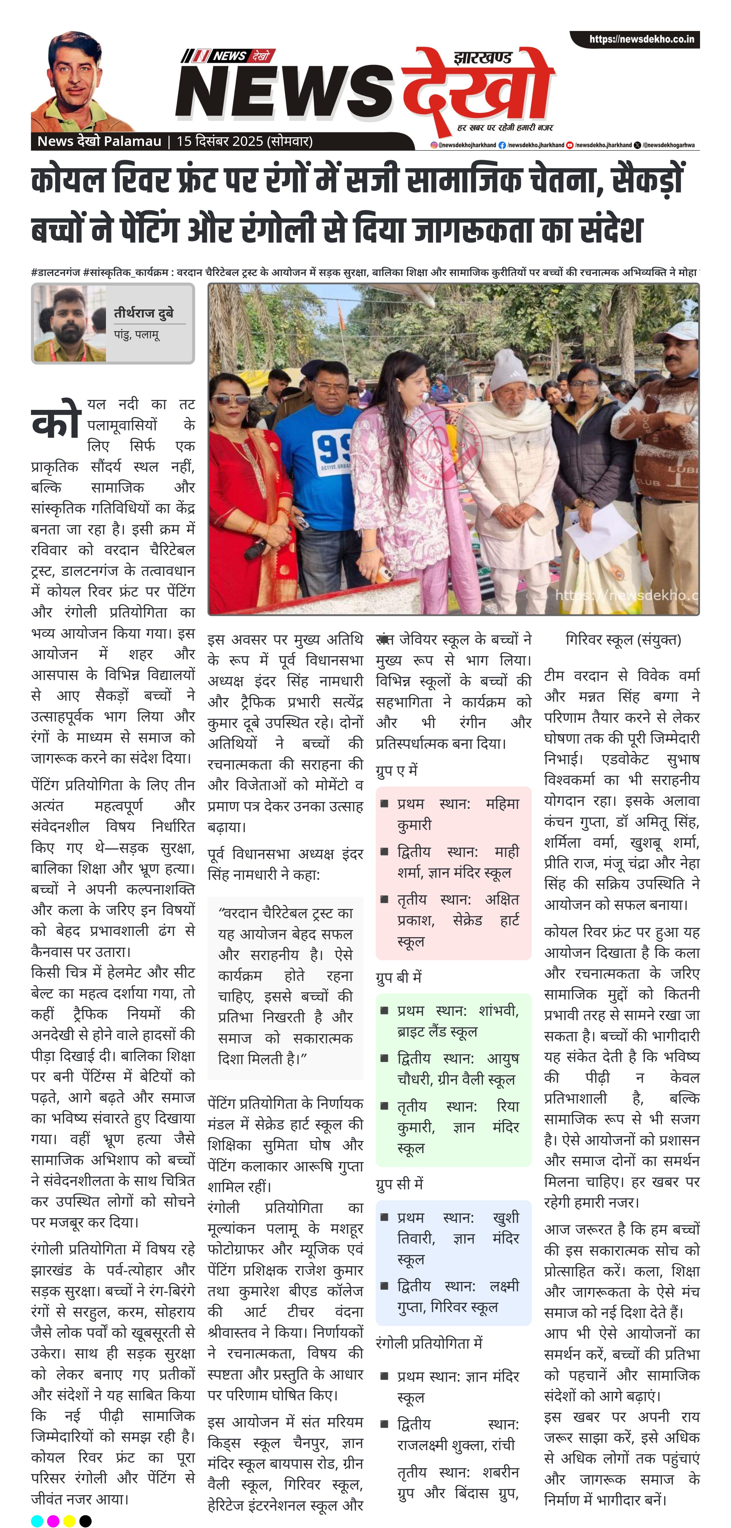 कोयल नदी का तट पलामूवासियों के लिए सिर्फ एक प्राकृतिक सौंदर्य स्थल नहीं, बल्कि सामाजिक और सांस्कृतिक गतिविधियों का केंद्र बनता जा रहा है। इसी क्रम में रविवार को वरदान चैरिटेबल ट्रस्ट, डालटनगंज के तत्वावधान में कोयल रिवर फ्रंट पर पेंटिंग और रंगोली प्रतियोगिता का भव्य आयोजन किया गया। इस आयोजन में शहर और आसपास के विभिन्न विद्यालयों से आए सैकड़ों बच्चों ने उत्साहपूर्वक भाग लिया और रंगों के माध्यम से समाज को जागरूक करने का संदेश दिया।