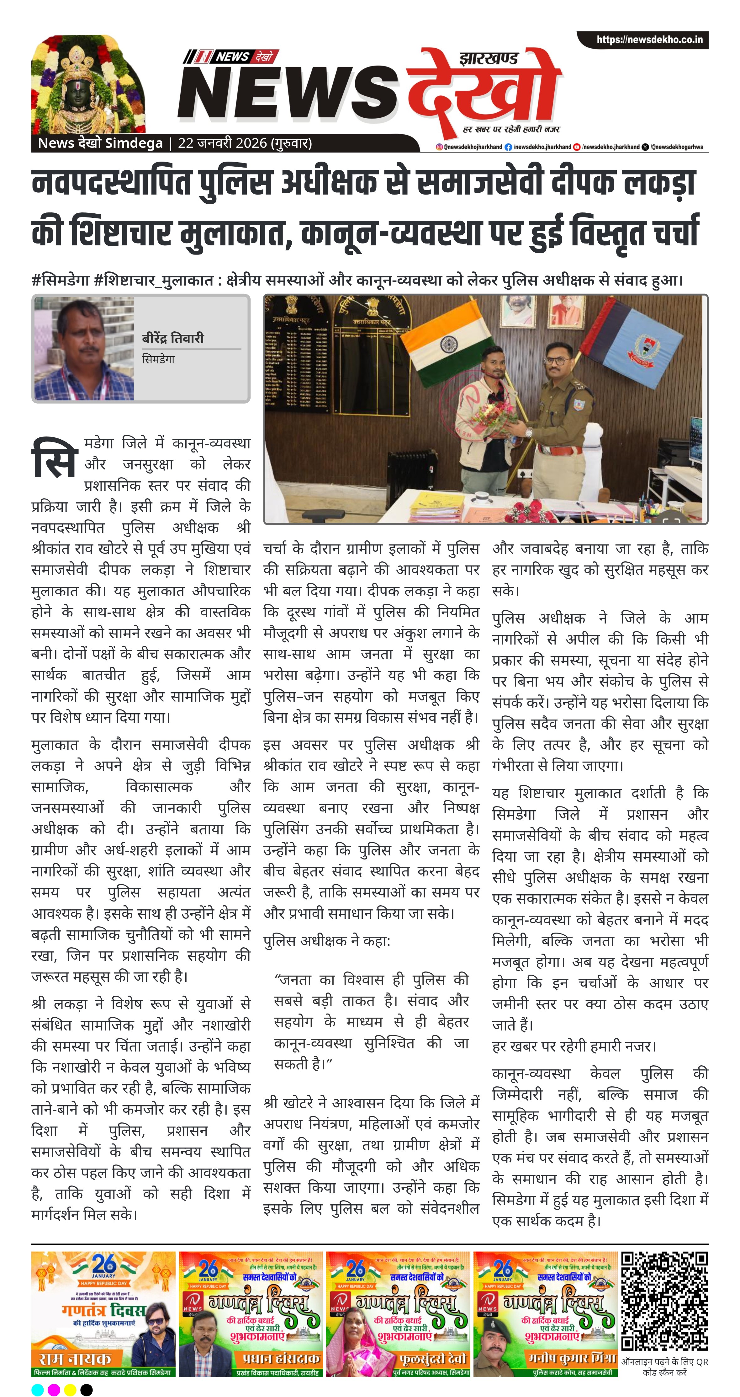 सिमडेगा जिले में कानून-व्यवस्था और जनसुरक्षा को लेकर प्रशासनिक स्तर पर संवाद की प्रक्रिया जारी है। इसी क्रम में जिले के नवपदस्थापित पुलिस अधीक्षक श्री श्रीकांत राव खोटरे से पूर्व उप मुखिया एवं समाजसेवी दीपक लकड़ा ने शिष्टाचार मुलाकात की। यह मुलाकात औपचारिक होने के साथ-साथ क्षेत्र की वास्तविक समस्याओं को सामने रखने का अवसर भी बनी। दोनों पक्षों के बीच सकारात्मक और सार्थक बातचीत हुई, जिसमें आम नागरिकों की सुरक्षा और सामाजिक मुद्दों पर विशेष ध्यान दिया गया।