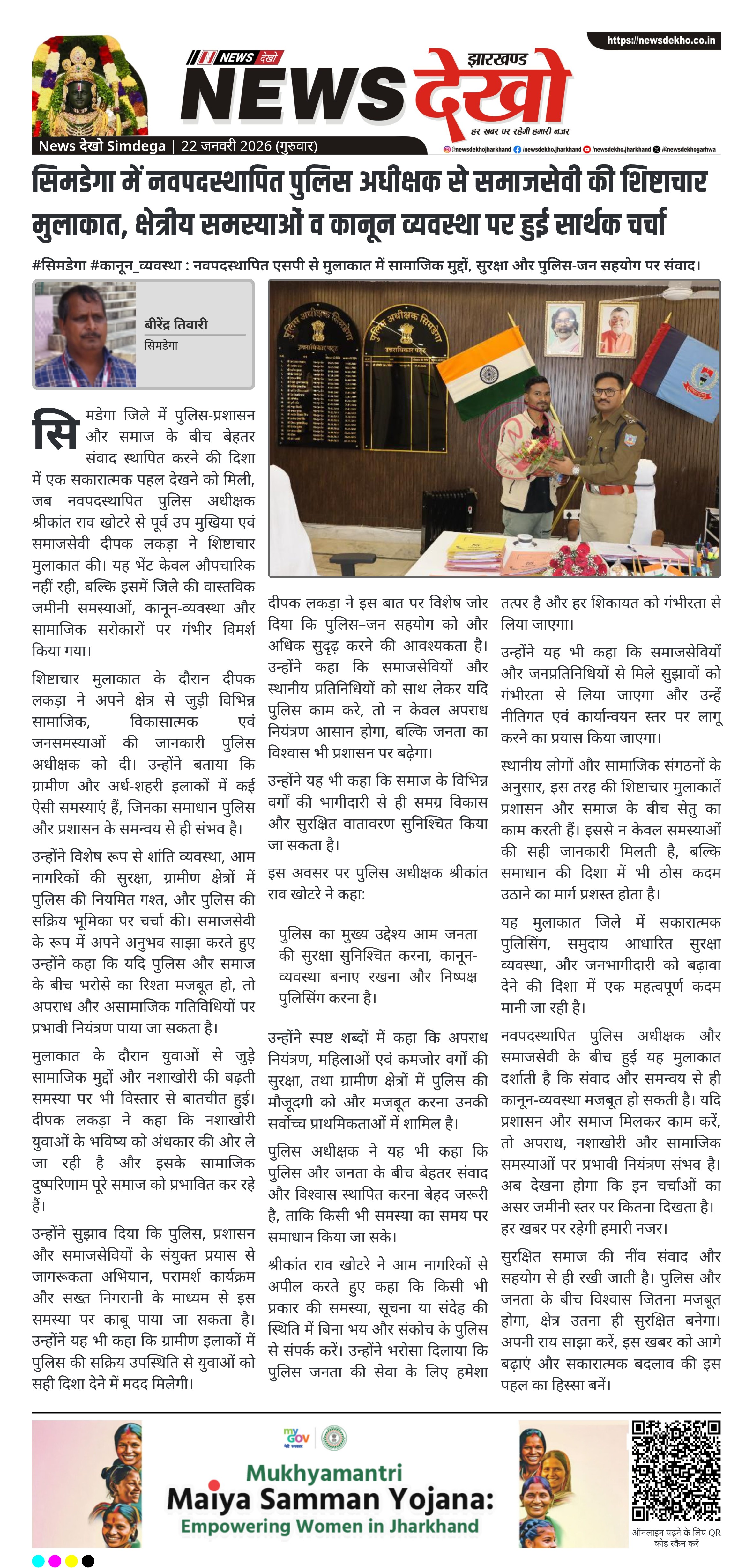 सिमडेगा जिले में पुलिस-प्रशासन और समाज के बीच बेहतर संवाद स्थापित करने की दिशा में एक सकारात्मक पहल देखने को मिली, जब नवपदस्थापित पुलिस अधीक्षक श्रीकांत राव खोटरे से पूर्व उप मुखिया एवं समाजसेवी दीपक लकड़ा ने शिष्टाचार मुलाकात की। यह भेंट केवल औपचारिक नहीं रही, बल्कि इसमें जिले की वास्तविक जमीनी समस्याओं, कानून-व्यवस्था और सामाजिक सरोकारों पर गंभीर विमर्श किया गया।