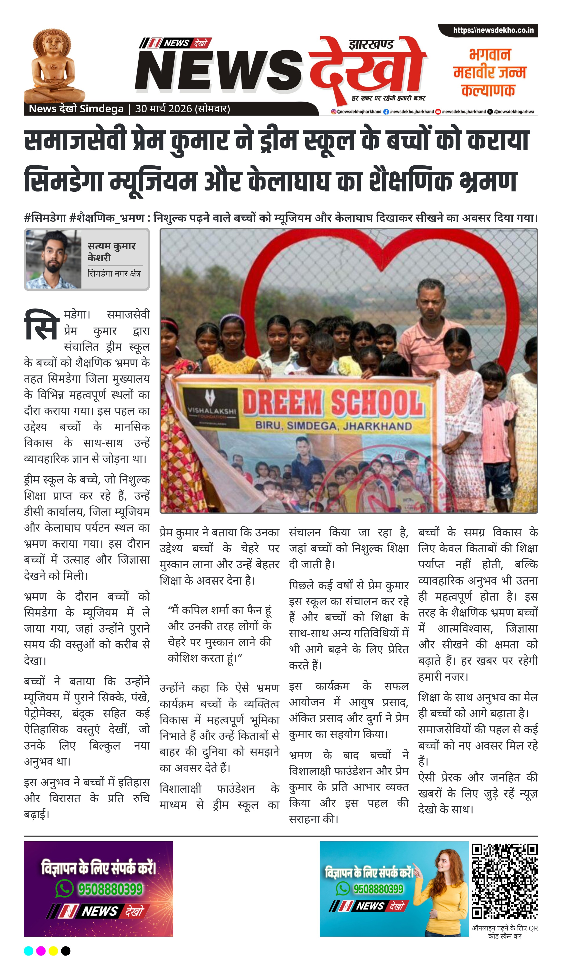 सिमडेगा में समाजसेवी प्रेम कुमार ने ड्रीम स्कूल के बच्चों के लिए शैक्षणिक भ्रमण का आयोजन किया। बच्चों को जिला मुख्यालय स्थित डीसी कार्यालय, म्यूजियम और केलाघाघ का दौरा कराया गया। इस पहल का उद्देश्य बच्चों के मानसिक विकास और सीखने के अनुभव को समृद्ध करना था।