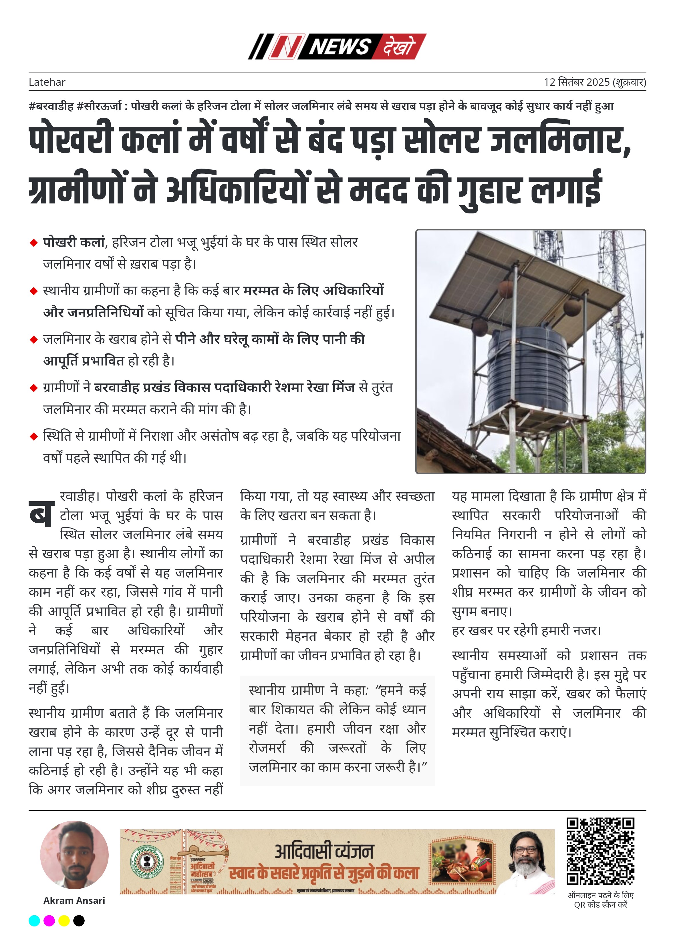 बरवाडीह। पोखरी कलां के हरिजन टोला भजू भुईयां के घर के पास स्थित सोलर जलमिनार लंबे समय से खराब पड़ा हुआ है। स्थानीय लोगों का कहना है कि कई वर्षों से यह जलमिनार काम नहीं कर रहा, जिससे गांव में पानी की आपूर्ति प्रभावित हो रही है। ग्रामीणों ने कई बार अधिकारियों और जनप्रतिनिधियों से मरम्मत की गुहार लगाई, लेकिन अभी तक कोई कार्यवाही नहीं हुई।