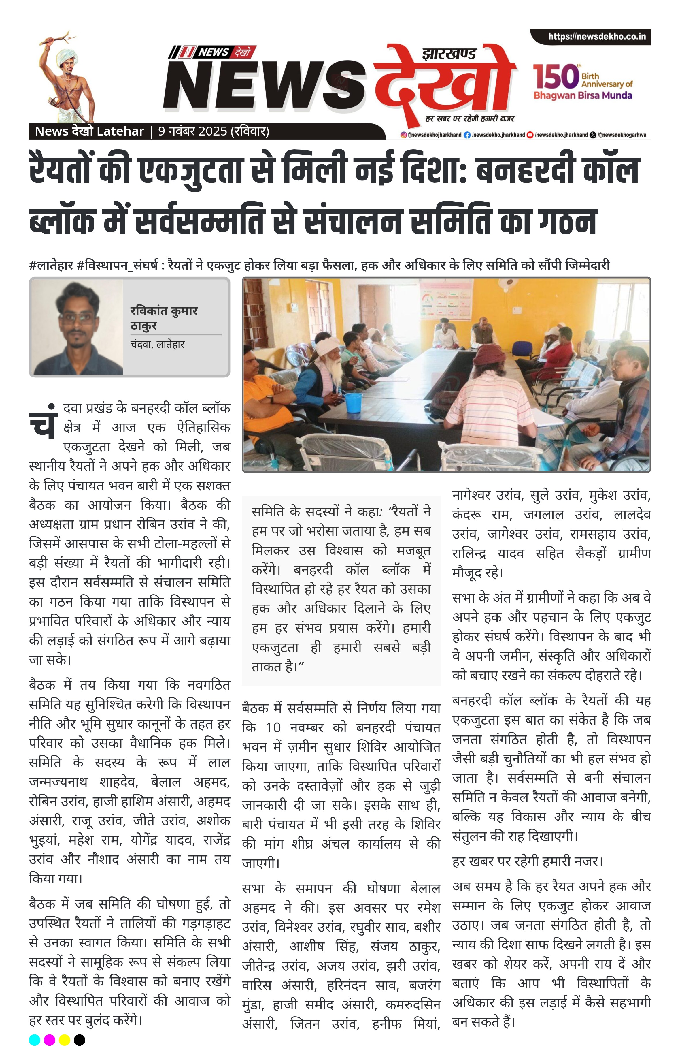 समिति के सदस्यों ने कहा: “रैयतों ने हम पर जो भरोसा जताया है, हम सब मिलकर उस विश्वास को मजबूत करेंगे। बनहरदी कॉल ब्लॉक में विस्थापित हो रहे हर रैयत को उसका हक और अधिकार दिलाने के लिए हम हर संभव प्रयास करेंगे। हमारी एकजुटता ही हमारी सबसे बड़ी ताकत है।”