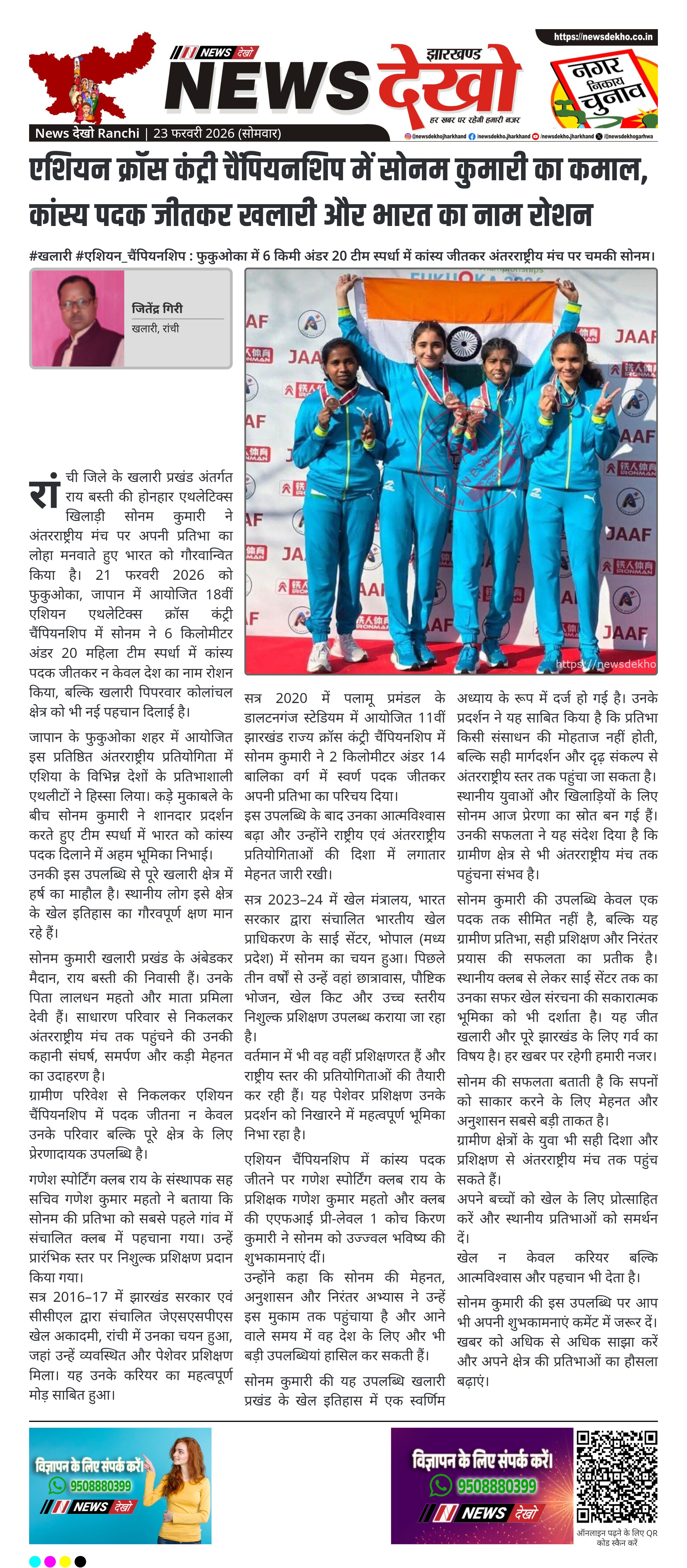 रांची जिले के खलारी प्रखंड की उभरती एथलेटिक्स खिलाड़ी सोनम कुमारी ने 21 फरवरी 2026 को जापान के फुकुओका में आयोजित 18वीं एशियन एथलेटिक्स क्रॉस कंट्री चैंपियनशिप में कांस्य पदक जीतकर भारत को गौरवान्वित किया। अंडर 20 महिला 6 किलोमीटर टीम स्पर्धा में उनके प्रदर्शन ने खलारी पिपरवार क्षेत्र का नाम अंतरराष्ट्रीय मंच पर रोशन कर दिया है।