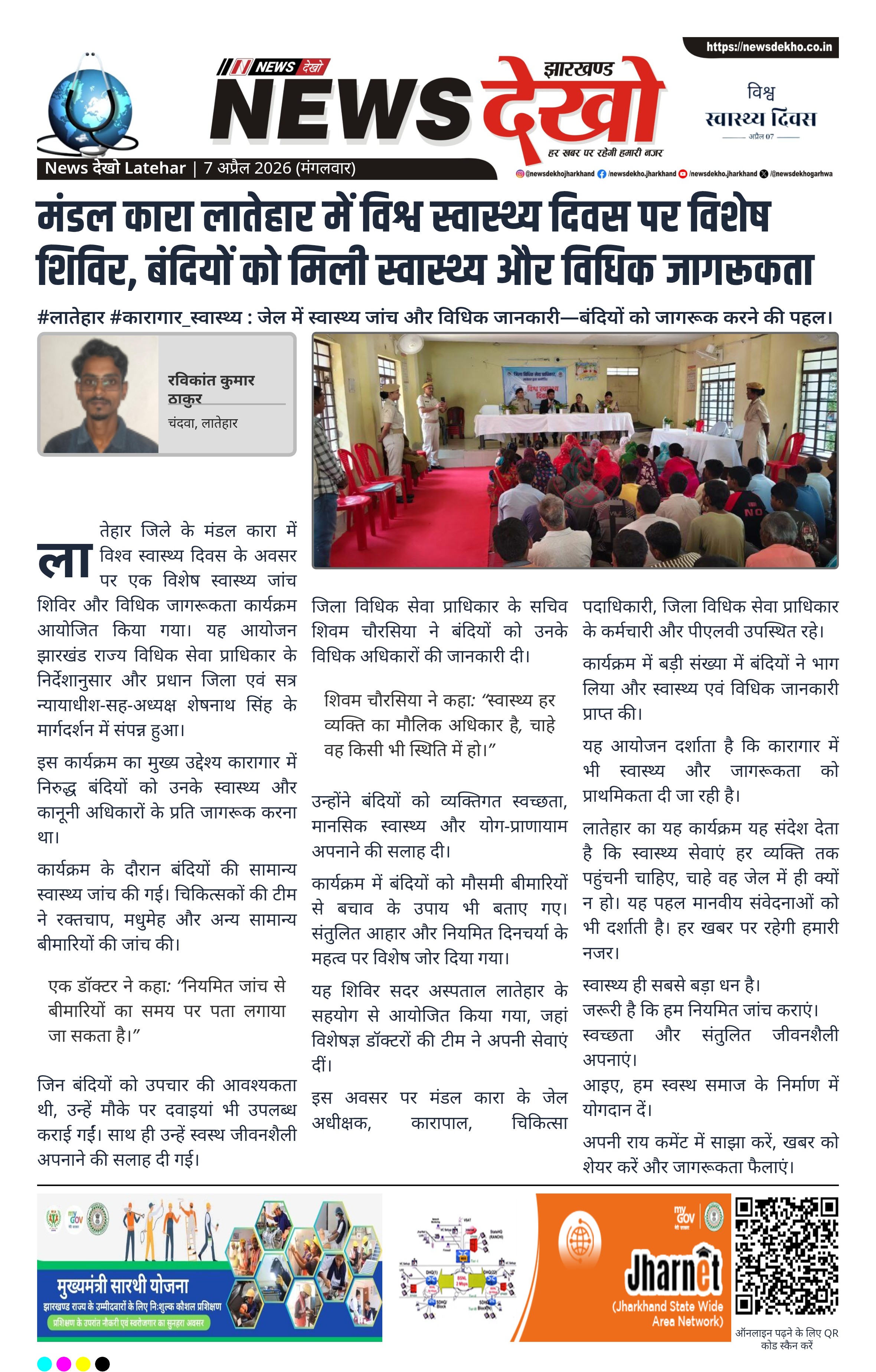 लातेहार मंडल कारा में विश्व स्वास्थ्य दिवस पर स्वास्थ्य जांच शिविर और विधिक जागरूकता कार्यक्रम आयोजित किया गया। इसमें बंदियों की स्वास्थ्य जांच कर उन्हें उपचार और सलाह दी गई। कार्यक्रम जिला विधिक सेवा प्राधिकार के मार्गदर्शन में हुआ। इस पहल का उद्देश्य बंदियों को स्वास्थ्य और अधिकारों के प्रति जागरूक करना था।