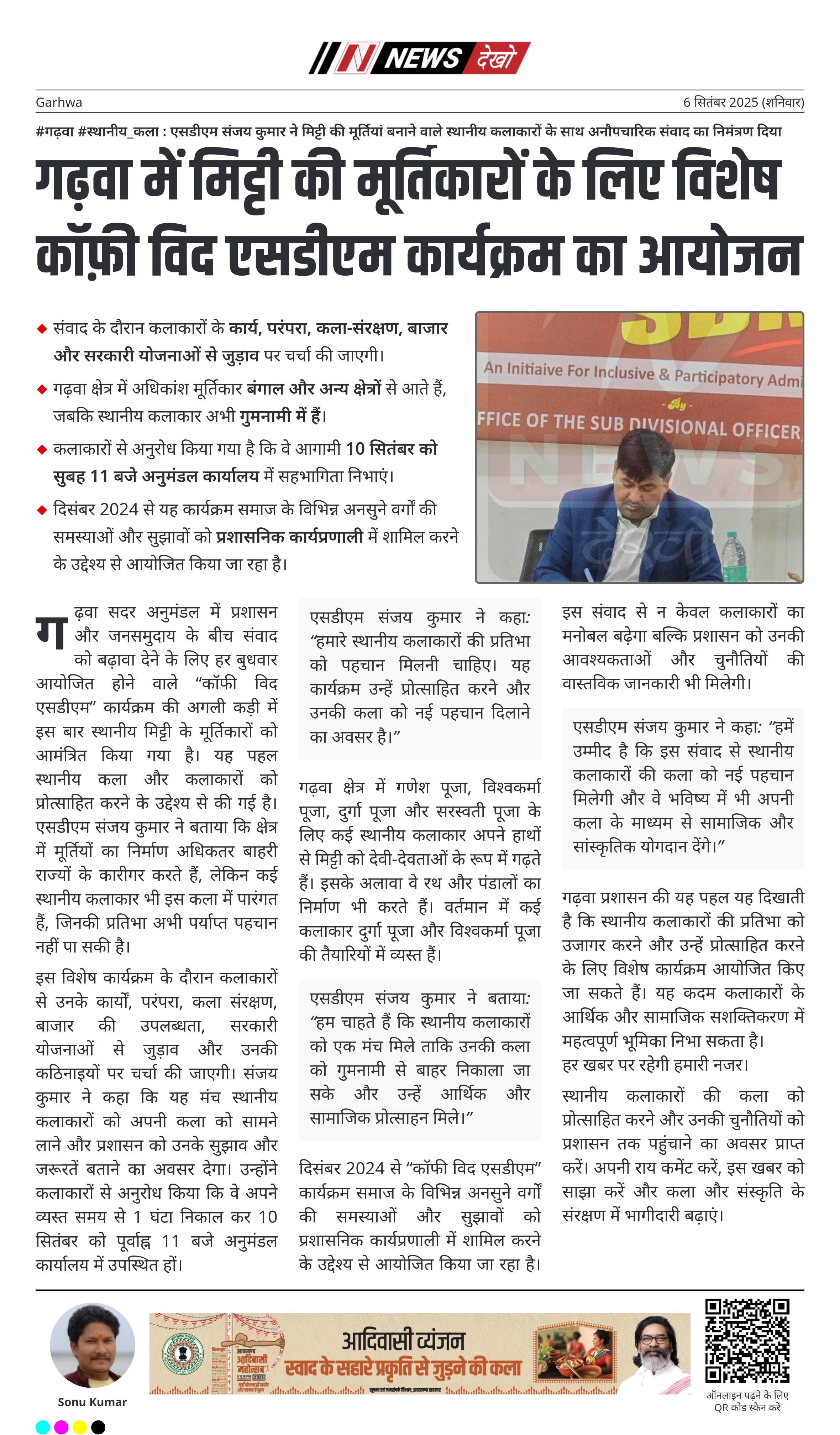 गढ़वा सदर अनुमंडल में प्रशासन और जनसमुदाय के बीच संवाद को बढ़ावा देने के लिए हर बुधवार आयोजित होने वाले “कॉफी विद एसडीएम” कार्यक्रम की अगली कड़ी में इस बार स्थानीय मिट्टी के मूर्तिकारों को आमंत्रित किया गया है। यह पहल स्थानीय कला और कलाकारों को प्रोत्साहित करने के उद्देश्य से की गई है। एसडीएम संजय कुमार ने बताया कि क्षेत्र में मूर्तियों का निर्माण अधिकतर बाहरी राज्यों के कारीगर करते हैं, लेकिन कई स्थानीय कलाकार भी इस कला में पारंगत हैं, जिनकी प्रतिभा अभी पर्याप्त पहचान नहीं पा सकी है।
