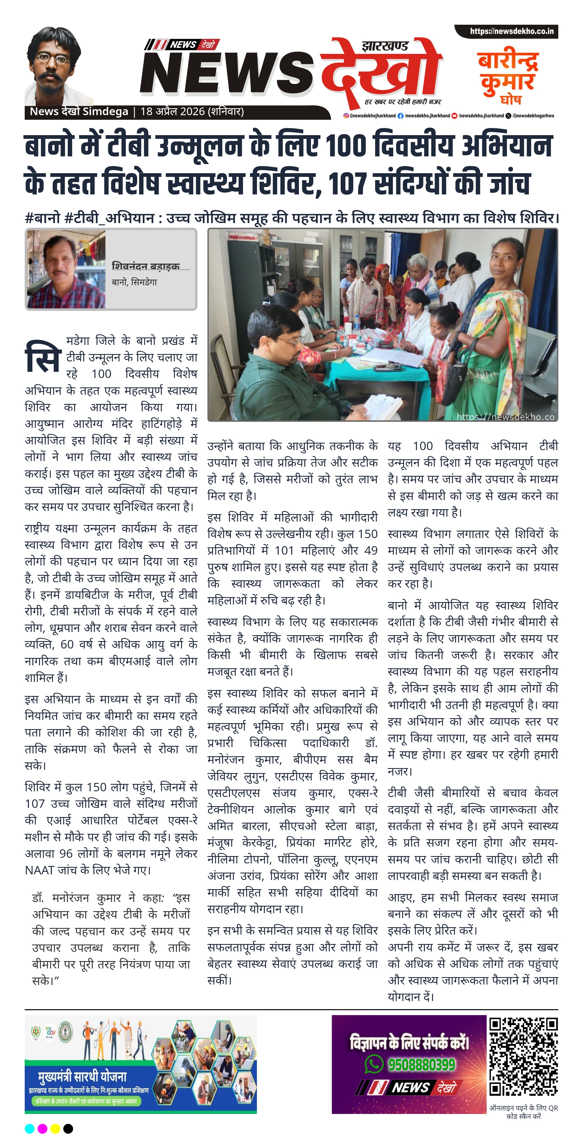 सिमडेगा जिले के बानो प्रखंड में टीबी उन्मूलन के 100 दिवसीय अभियान के तहत स्वास्थ्य शिविर आयोजित किया गया। इस दौरान 150 लोगों की जांच की गई, जिनमें 107 उच्च जोखिम वाले संदिग्धों का एक्स-रे हुआ। साथ ही 96 लोगों के बलगम नमूने NAAT जांच के लिए लिए गए। यह अभियान टीबी की समय पर पहचान और रोकथाम के लिए महत्वपूर्ण माना जा रहा है।