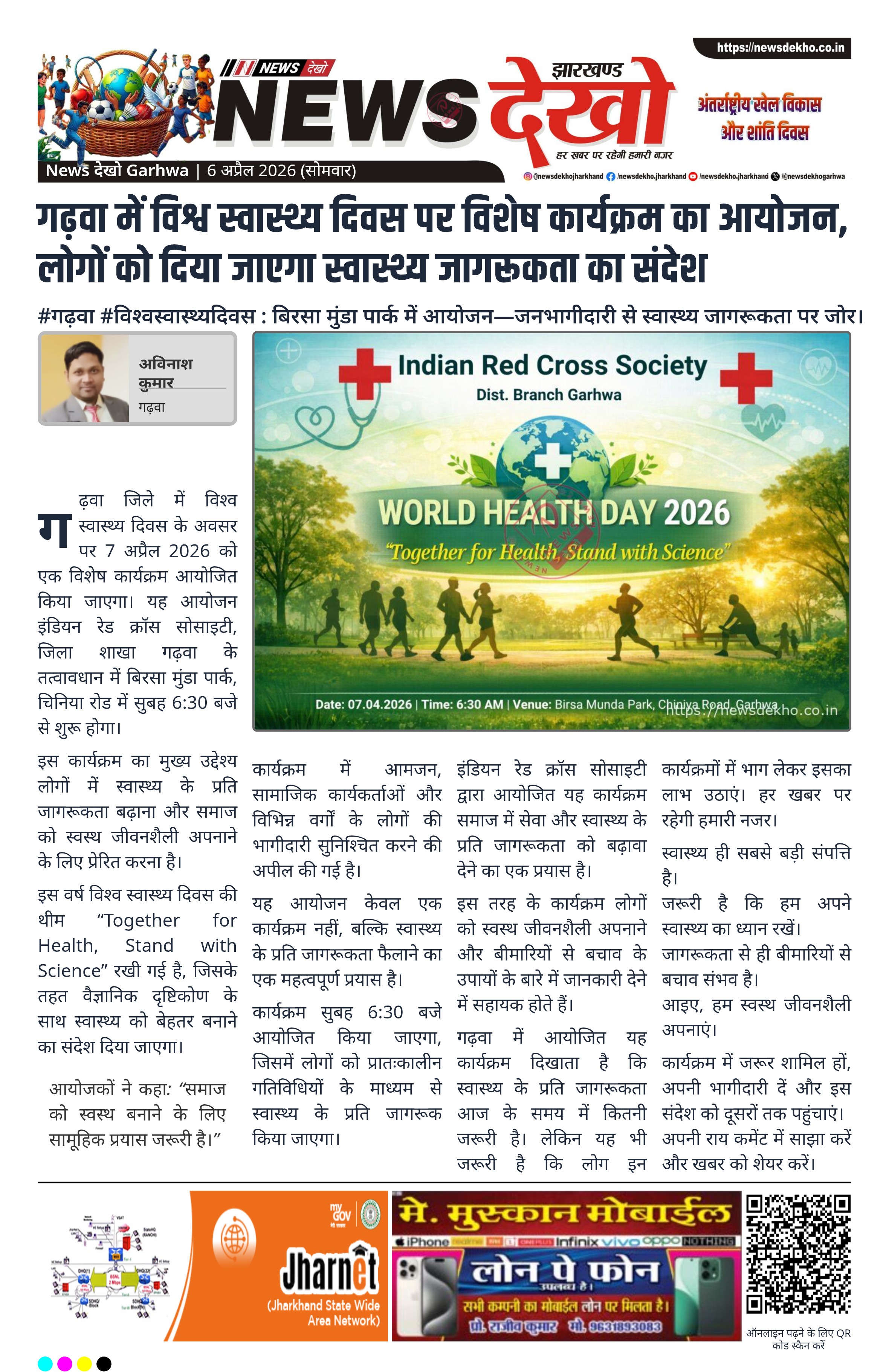 गढ़वा जिले में विश्व स्वास्थ्य दिवस के अवसर पर 7 अप्रैल 2026 को एक विशेष कार्यक्रम आयोजित किया जाएगा। यह आयोजन इंडियन रेड क्रॉस सोसाइटी, जिला शाखा गढ़वा के तत्वावधान में बिरसा मुंडा पार्क, चिनिया रोड में सुबह 6:30 बजे से शुरू होगा।