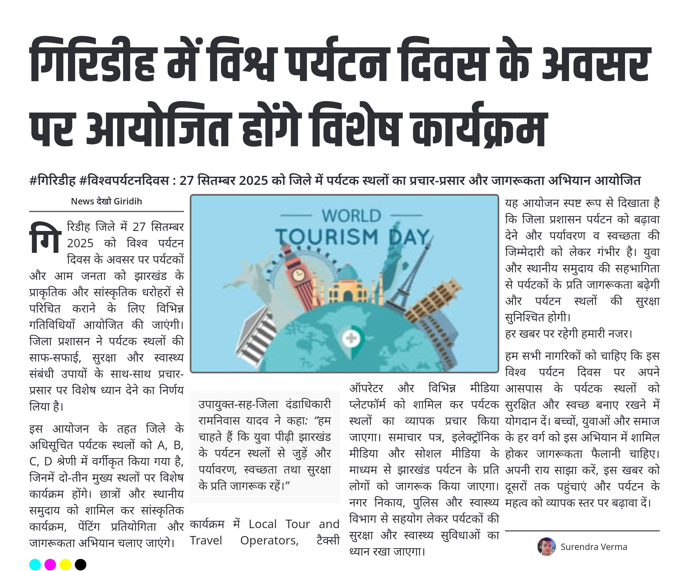 #गिरिडीह #विश्वपर्यटनदिवस : 27 सितम्बर 2025 को जिले में पर्यटक स्थलों का प्रचार-प्रसार और जागरूकता अभियान आयोजित