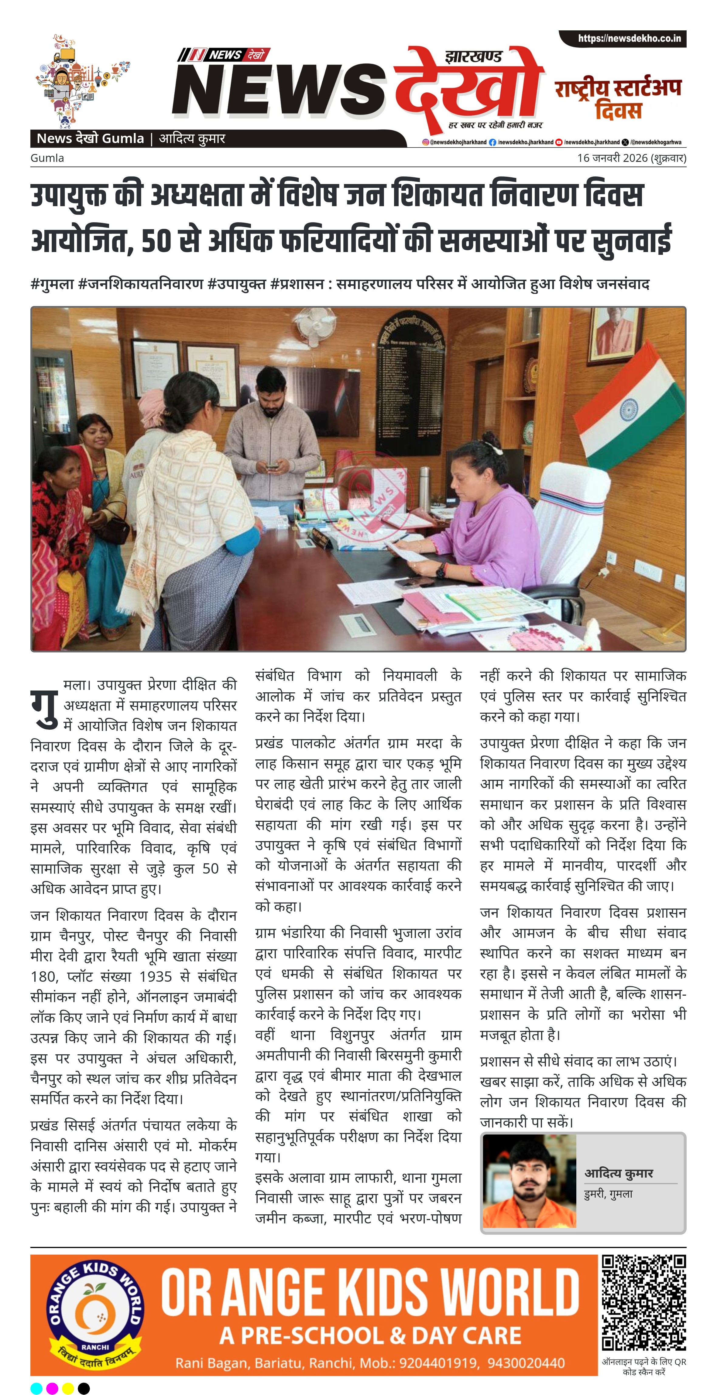 गुमला। उपायुक्त प्रेरणा दीक्षित की अध्यक्षता में समाहरणालय परिसर में आयोजित विशेष जन शिकायत निवारण दिवस के दौरान जिले के दूर-दराज एवं ग्रामीण क्षेत्रों से आए नागरिकों ने अपनी व्यक्तिगत एवं सामूहिक समस्याएं सीधे उपायुक्त के समक्ष रखीं। इस अवसर पर भूमि विवाद, सेवा संबंधी मामले, पारिवारिक विवाद, कृषि एवं सामाजिक सुरक्षा से जुड़े कुल 50 से अधिक आवेदन प्राप्त हुए।