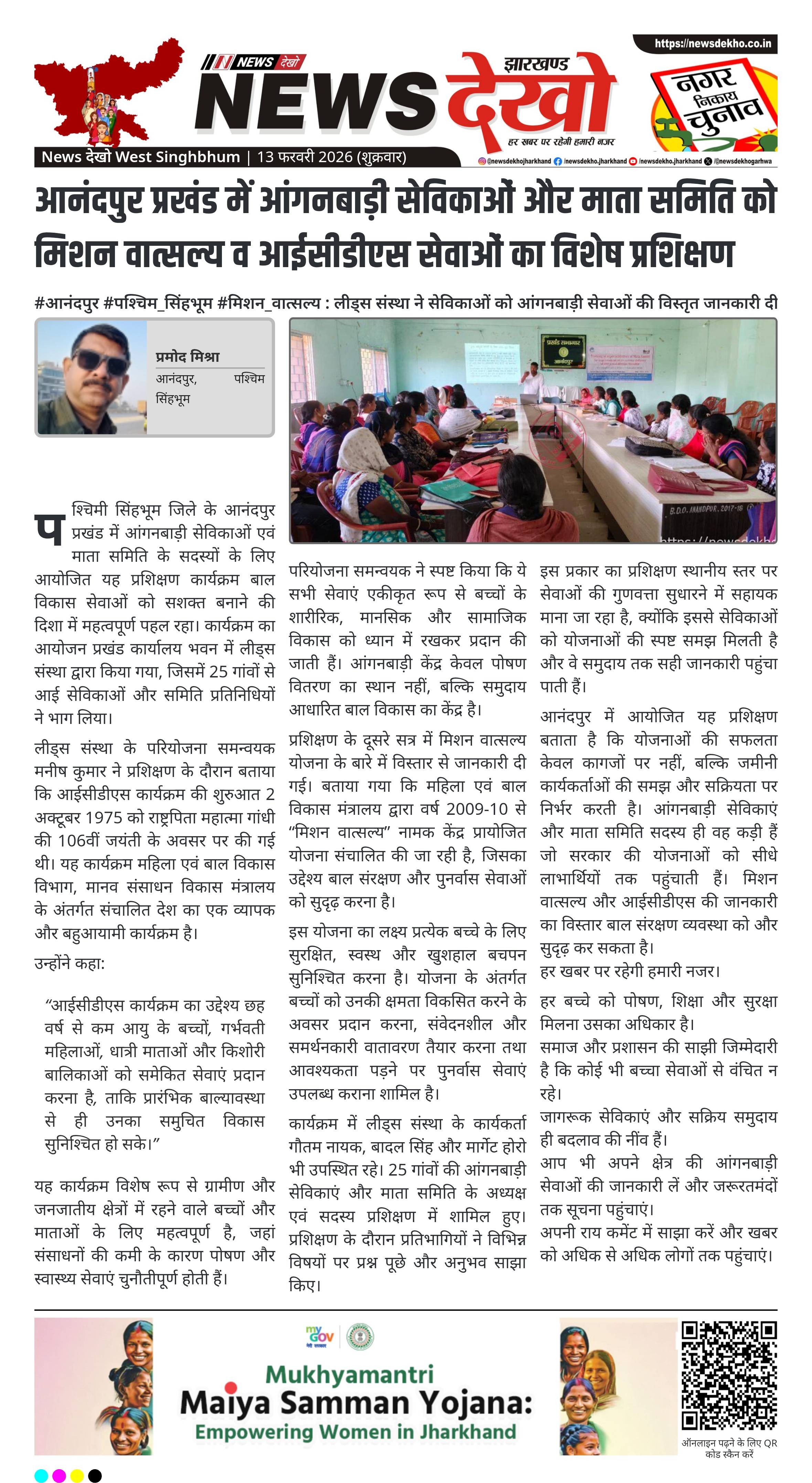 पश्चिमी सिंहभूम के आनंदपुर प्रखंड कार्यालय भवन में लीड्स संस्था द्वारा आंगनबाड़ी सेविकाओं और माता समिति सदस्यों के लिए एक दिवसीय प्रशिक्षण आयोजित किया गया। प्रशिक्षण में आईसीडीएस कार्यक्रम की छह प्रमुख सेवाओं और मिशन वात्सल्य योजना की जानकारी दी गई। कार्यक्रम में 25 गांवों की प्रतिनिधियों ने भाग लिया। इसका उद्देश्य बाल संरक्षण और पोषण सेवाओं को मजबूत करना था।