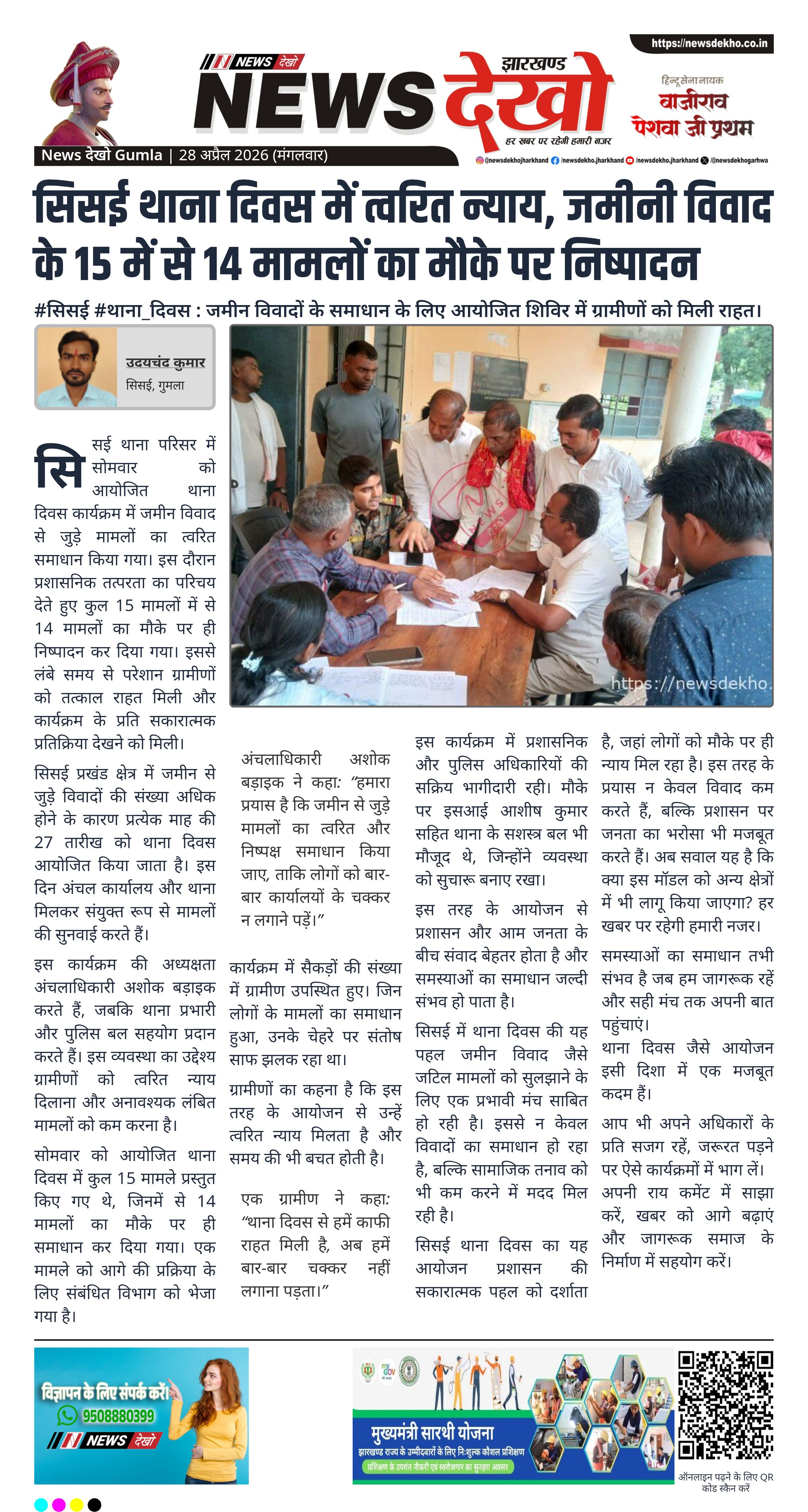 सिसई थाना परिसर में सोमवार को आयोजित थाना दिवस कार्यक्रम में जमीन विवाद से जुड़े मामलों का त्वरित समाधान किया गया। इस दौरान प्रशासनिक तत्परता का परिचय देते हुए कुल 15 मामलों में से 14 मामलों का मौके पर ही निष्पादन कर दिया गया। इससे लंबे समय से परेशान ग्रामीणों को तत्काल राहत मिली और कार्यक्रम के प्रति सकारात्मक प्रतिक्रिया देखने को मिली।