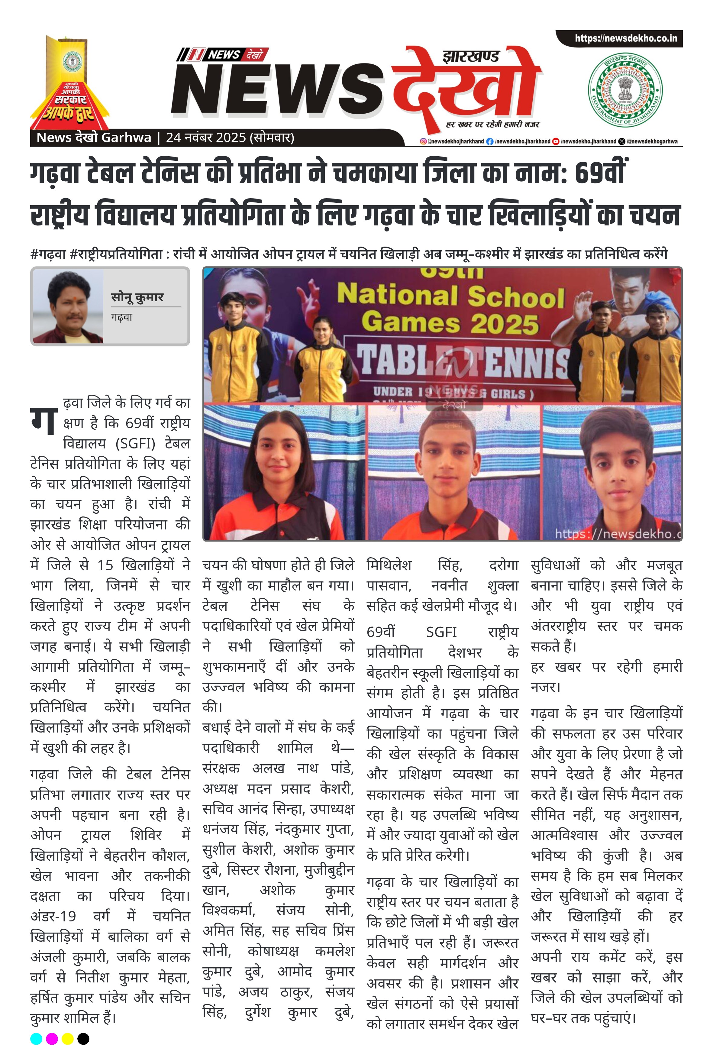 गढ़वा टेबल टेनिस की प्रतिभा ने चमकाया जिला का नाम: 69वीं राष्ट्रीय विद्यालय प्रतियोगिता के लिए गढ़वा के चार खिलाड़ियों का चयन