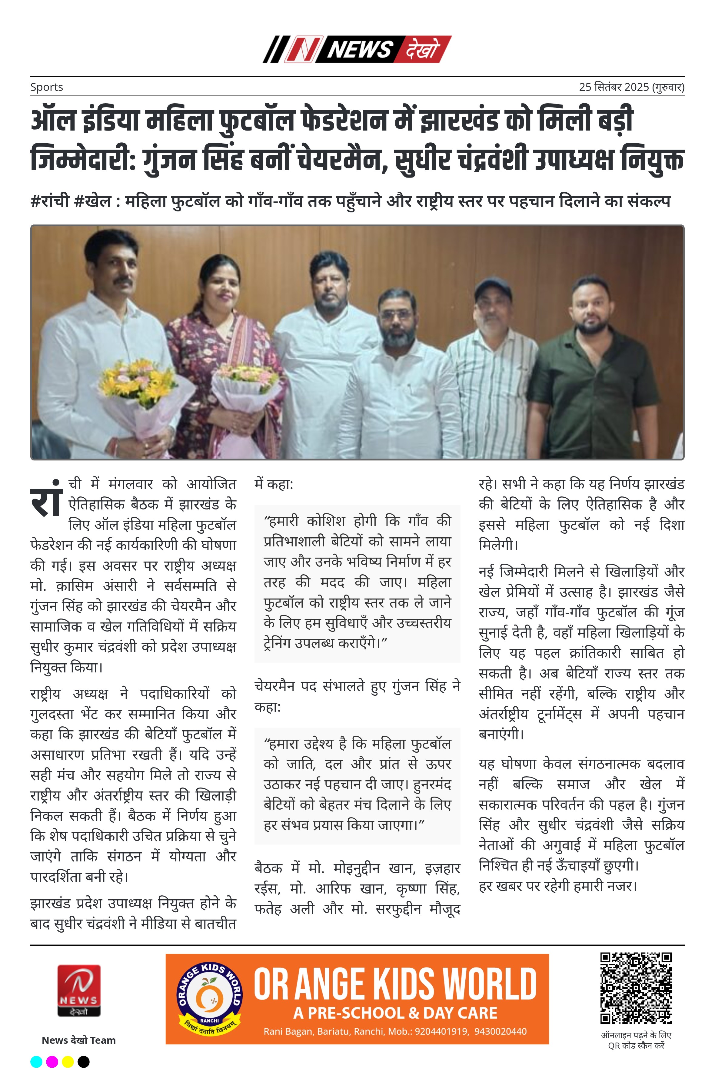 #रांची #खेल : महिला फुटबॉल को गाँव-गाँव तक पहुँचाने और राष्ट्रीय स्तर पर पहचान दिलाने का संकल्प गुंजन सिंह बनीं झारखंड की चेयरमैन। सुधीर चंद्रवंशी को मिला प्रदेश उपाध्यक्ष का दायित्व। मो. क़ासिम अंसारी ने किया नई कार्यकारिणी का ऐलान। गाँव-गाँव महिला फुटबॉल को बढ़ावा देने की योजना। प्रतिभा और…