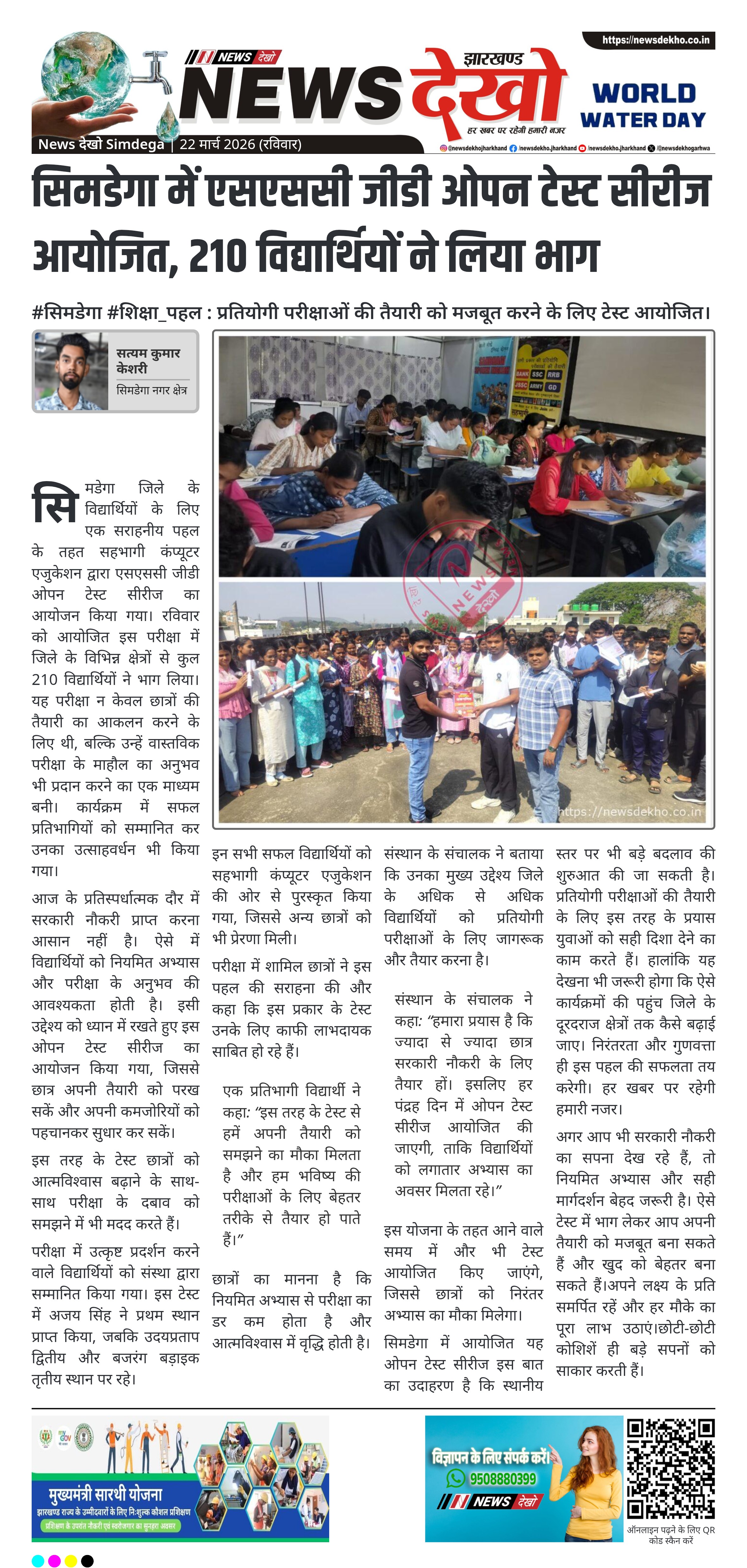 सिमडेगा जिले में सहभागी कंप्यूटर एजुकेशन द्वारा एसएससी जीडी ओपन टेस्ट सीरीज का आयोजन किया गया, जिसमें 210 विद्यार्थियों ने भाग लिया। यह परीक्षा रविवार को आयोजित हुई और इसका उद्देश्य छात्रों को प्रतियोगी परीक्षाओं के लिए तैयार करना था। कार्यक्रम में उत्कृष्ट प्रदर्शन करने वाले विद्यार्थियों को पुरस्कृत भी किया गया। यह पहल युवाओं को सरकारी नौकरी के प्रति प्रेरित करने की दिशा में महत्वपूर्ण मानी जा रही है।