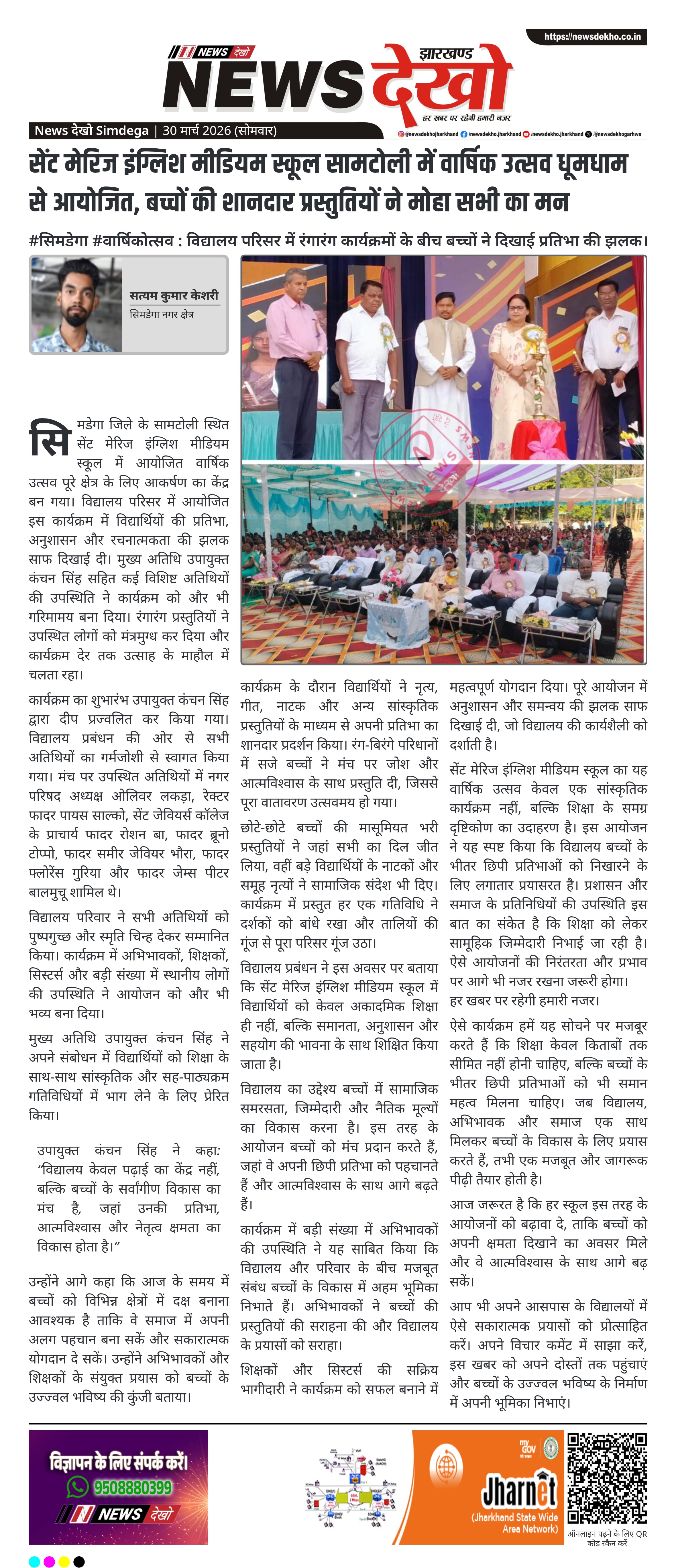 सिमडेगा जिले के सामटोली स्थित सेंट मेरिज इंग्लिश मीडियम स्कूल में आयोजित वार्षिक उत्सव पूरे क्षेत्र के लिए आकर्षण का केंद्र बन गया। विद्यालय परिसर में आयोजित इस कार्यक्रम में विद्यार्थियों की प्रतिभा, अनुशासन और रचनात्मकता की झलक साफ दिखाई दी। मुख्य अतिथि उपायुक्त कंचन सिंह सहित कई विशिष्ट अतिथियों की उपस्थिति ने कार्यक्रम को और भी गरिमामय बना दिया। रंगारंग प्रस्तुतियों ने उपस्थित लोगों को मंत्रमुग्ध कर दिया और कार्यक्रम देर तक उत्साह के माहौल में चलता रहा।