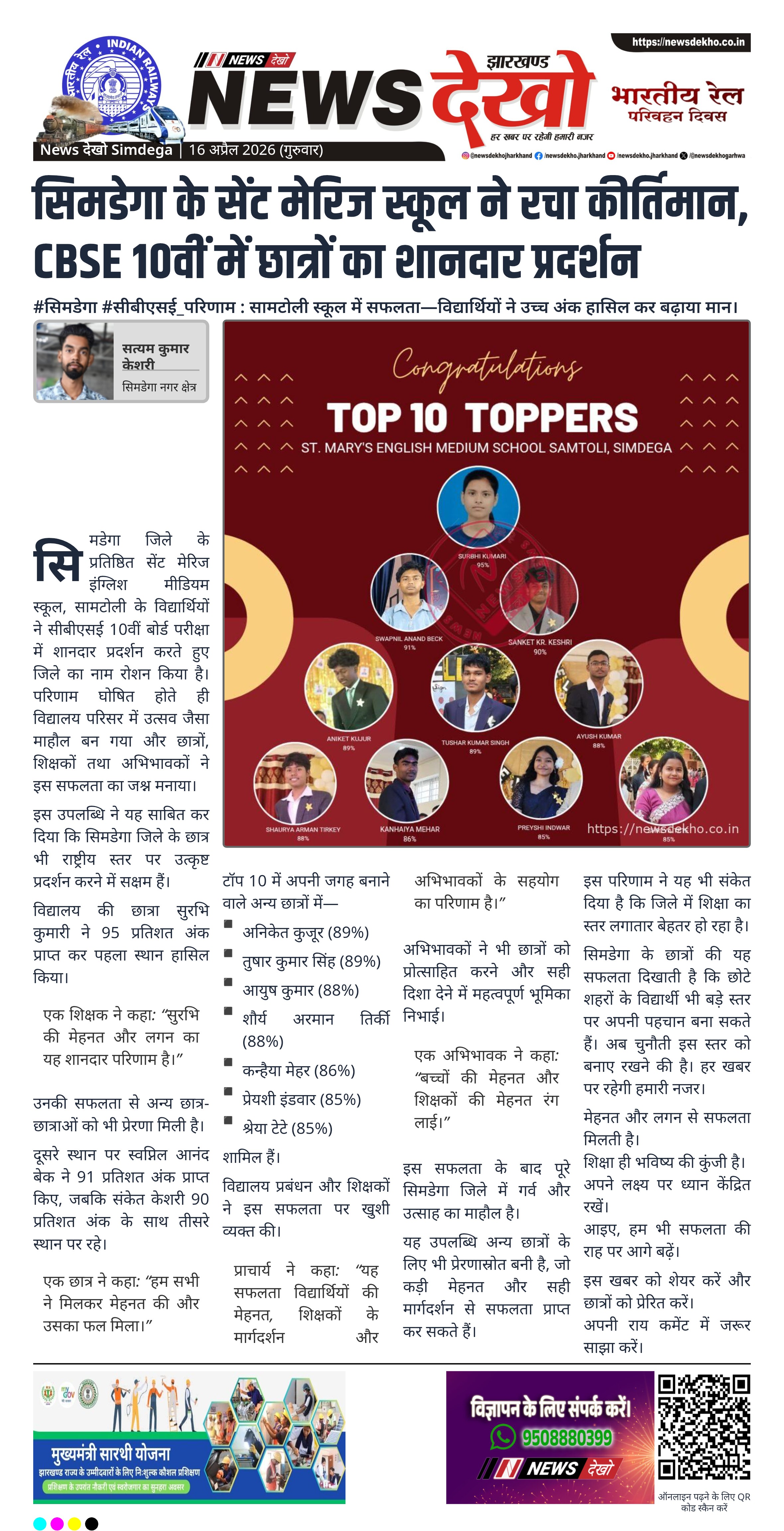 सिमडेगा के सेंट मेरिज इंग्लिश मीडियम स्कूल के छात्रों ने CBSE 10वीं में उत्कृष्ट प्रदर्शन किया। सुरभि कुमारी ने 95 प्रतिशत अंक लाकर पहला स्थान प्राप्त किया। कई छात्रों ने टॉप 10 में जगह बनाई। विद्यालय में खुशी का माहौल है।