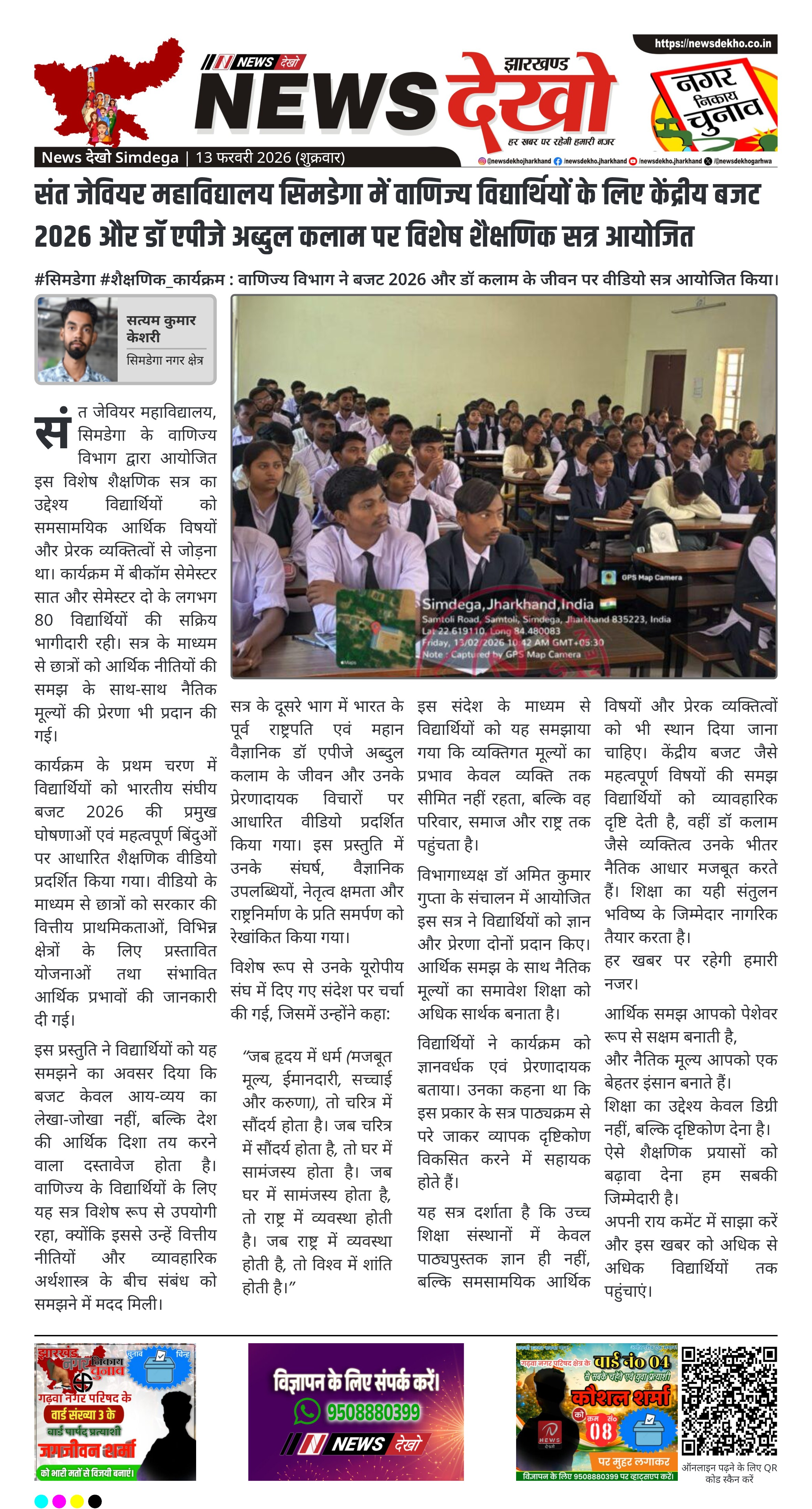 संत जेवियर महाविद्यालय, सिमडेगा के वाणिज्य विभाग द्वारा बीकॉम सेमेस्टर सात और सेमेस्टर दो के लगभग 80 विद्यार्थियों के लिए शैक्षणिक वीडियो सत्र आयोजित किया गया। सत्र में केंद्रीय बजट 2026 की प्रमुख घोषणाओं और पूर्व राष्ट्रपति डॉ एपीजे अब्दुल कलाम के प्रेरक जीवन पर आधारित प्रस्तुतियां दिखाई गईं। कार्यक्रम का संचालन विभागाध्यक्ष डॉ अमित कुमार गुप्ता ने किया।