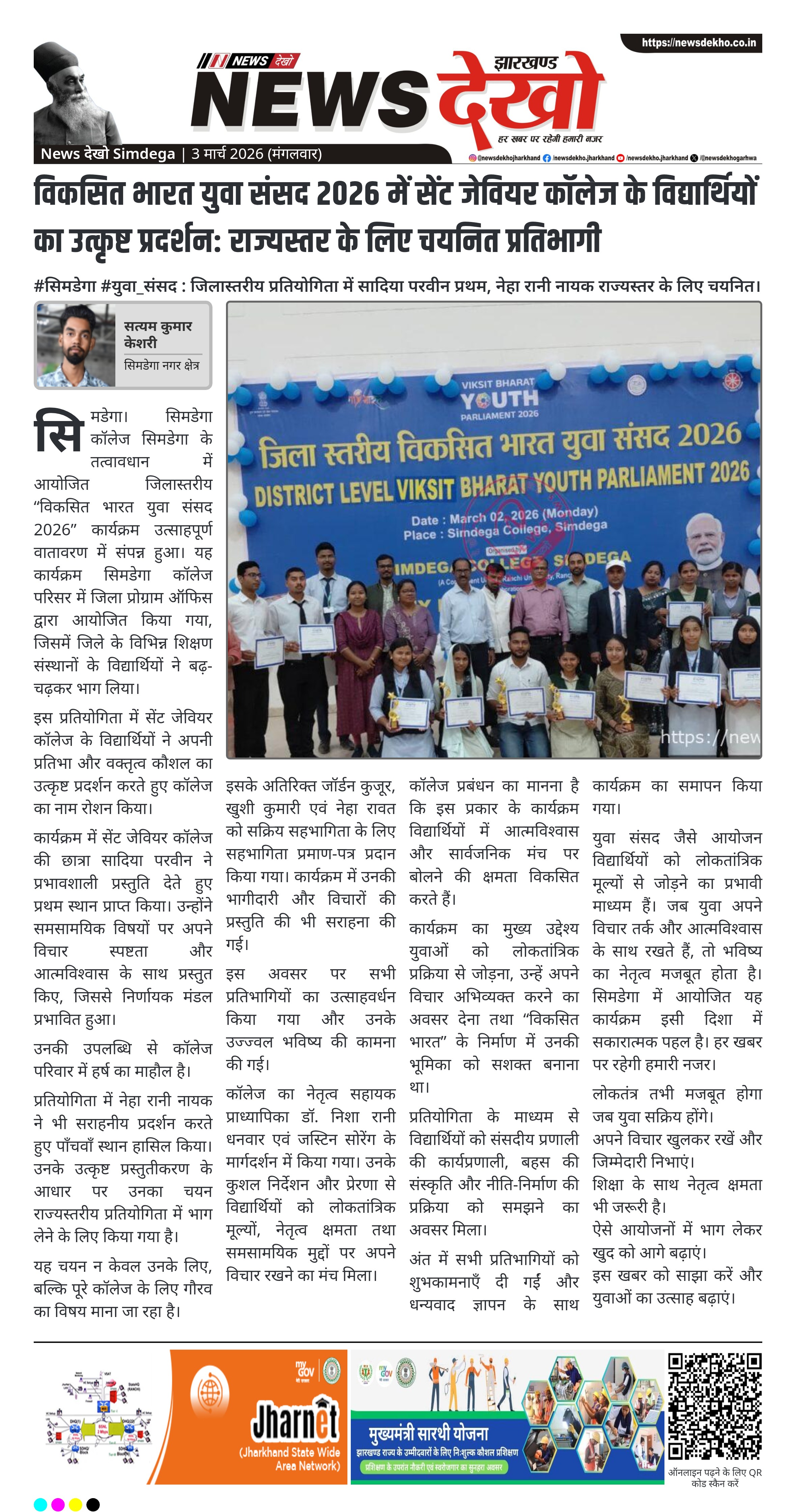 सिमडेगा कॉलेज सिमडेगा के तत्वावधान में आयोजित जिलास्तरीय “विकसित भारत युवा संसद 2026” कार्यक्रम सफलतापूर्वक संपन्न हुआ। सिमडेगा कॉलेज परिसर में आयोजित इस प्रतियोगिता में सेंट जेवियर कॉलेज के विद्यार्थियों ने उत्कृष्ट प्रदर्शन किया। सादिया परवीन ने प्रथम स्थान प्राप्त किया, जबकि नेहा रानी नायक राज्यस्तर के लिए चयनित हुईं।