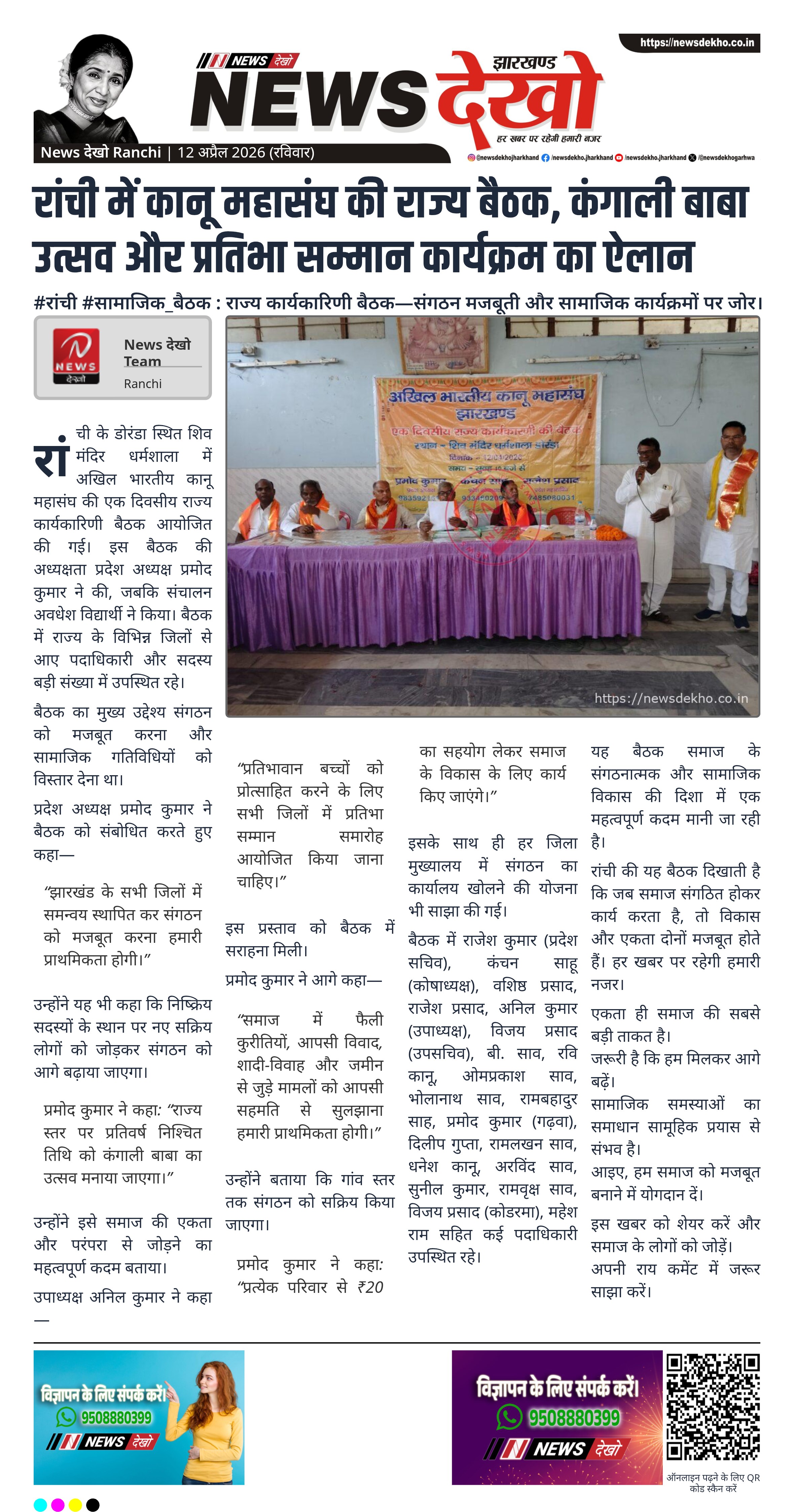 रांची में अखिल भारतीय कानू महासंघ की राज्य कार्यकारिणी बैठक आयोजित हुई। इसमें संगठन को मजबूत करने और सामाजिक कार्यक्रमों पर चर्चा हुई। कंगाली बाबा उत्सव और प्रतिभा सम्मान समारोह आयोजित करने का निर्णय लिया गया। विभिन्न जिलों के पदाधिकारी बैठक में शामिल हुए।