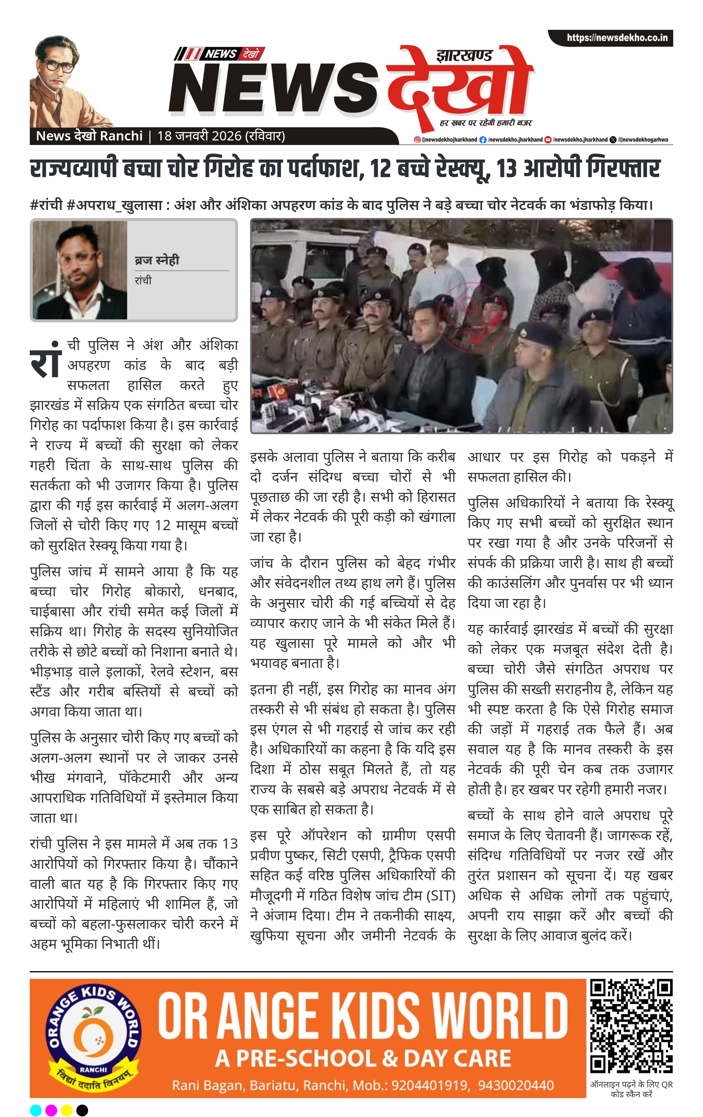रांची में अंश और अंशिका अपहरण कांड के बाद पुलिस ने राज्यव्यापी बच्चा चोर गिरोह का खुलासा किया है। विशेष जांच टीम ने झारखंड के कई जिलों से चोरी किए गए 12 बच्चों को सुरक्षित रेस्क्यू किया है। इस मामले में 13 आरोपियों को गिरफ्तार किया गया है, जिनमें महिलाएं भी शामिल हैं। जांच में बच्चों से जबरन भीख मंगवाने, अपराध और देह व्यापार जैसे गंभीर खुलासे सामने आए हैं।