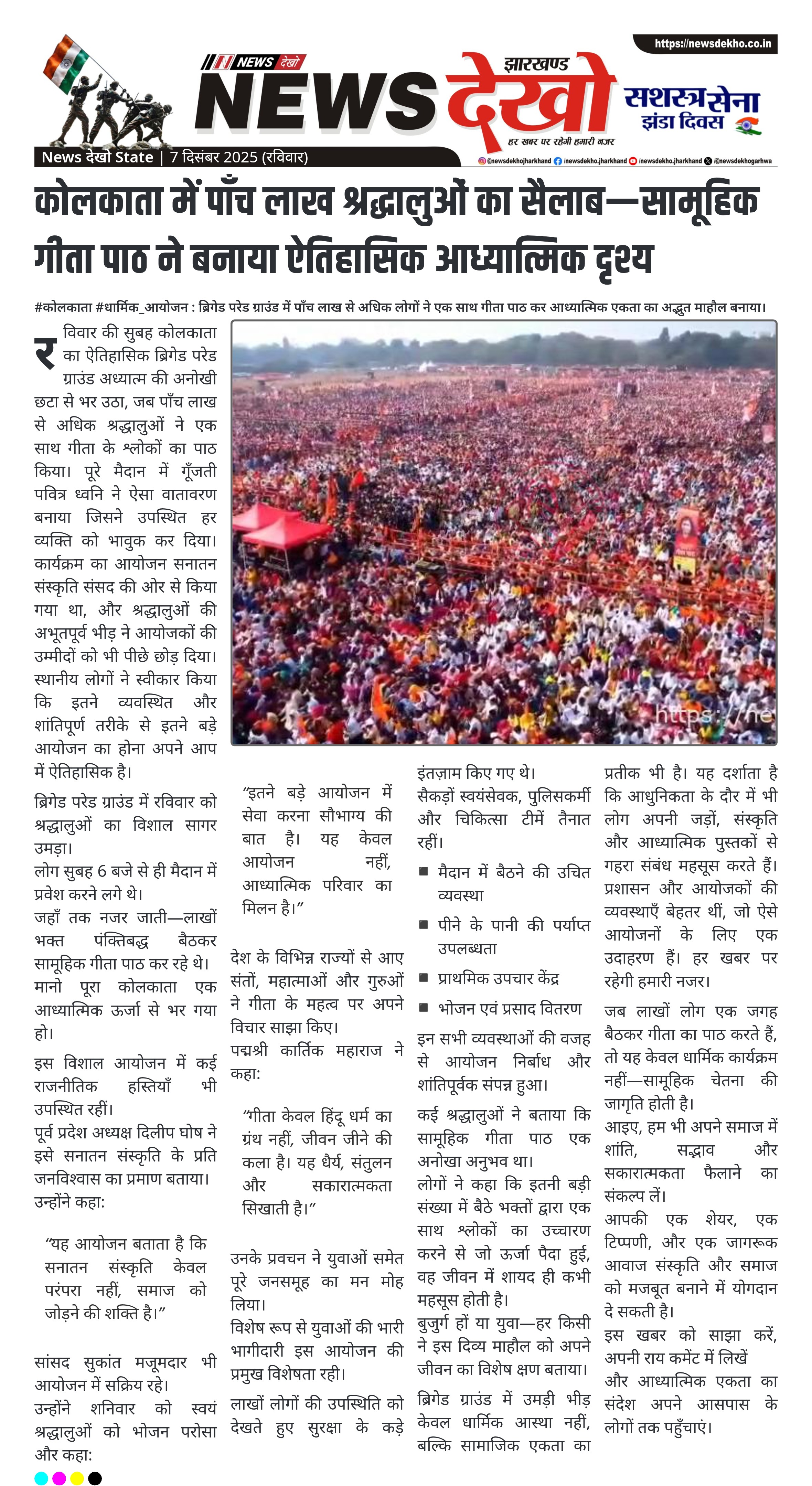 #कोलकाता #धार्मिक_आयोजन : ब्रिगेड परेड ग्राउंड में पाँच लाख से अधिक लोगों ने एक साथ गीता पाठ कर आध्यात्मिक एकता का अद्भुत माहौल बनाया। ब्रिगेड परेड ग्राउंड में पाँच लाख से अधिक लोगों की उपस्थिति। आयोजन सनातन संस्कृति संसद द्वारा किया गया। दिलीप घोष और सुकांत मजूमदार समेत कई नेता…