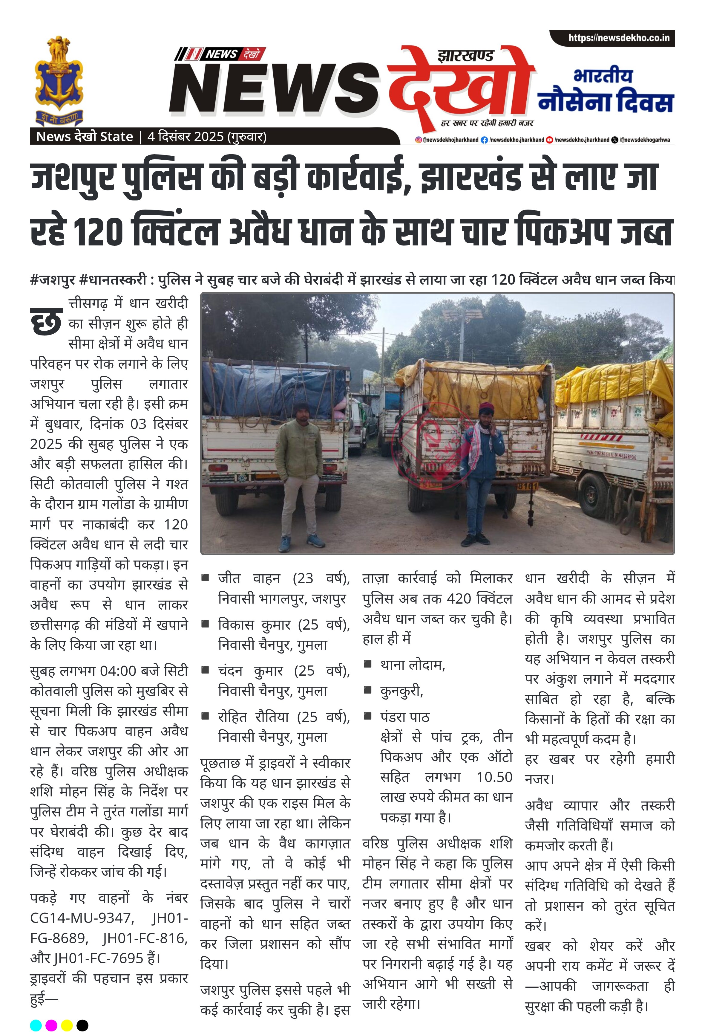 #जशपुर #धानतस्करी : पुलिस ने सुबह चार बजे की घेराबंदी में झारखंड से लाया जा रहा 120 क्विंटल अवैध धान जब्त किया 120 क्विंटल अवैध धान से लदी 4 पिकअप गाड़ियाँ जब्त। धान की अनुमानित कीमत 3 लाख रुपये। पकड़ाए ड्राइवर झारखंड के गुमला और जशपुर के निवासी। धान लाने…